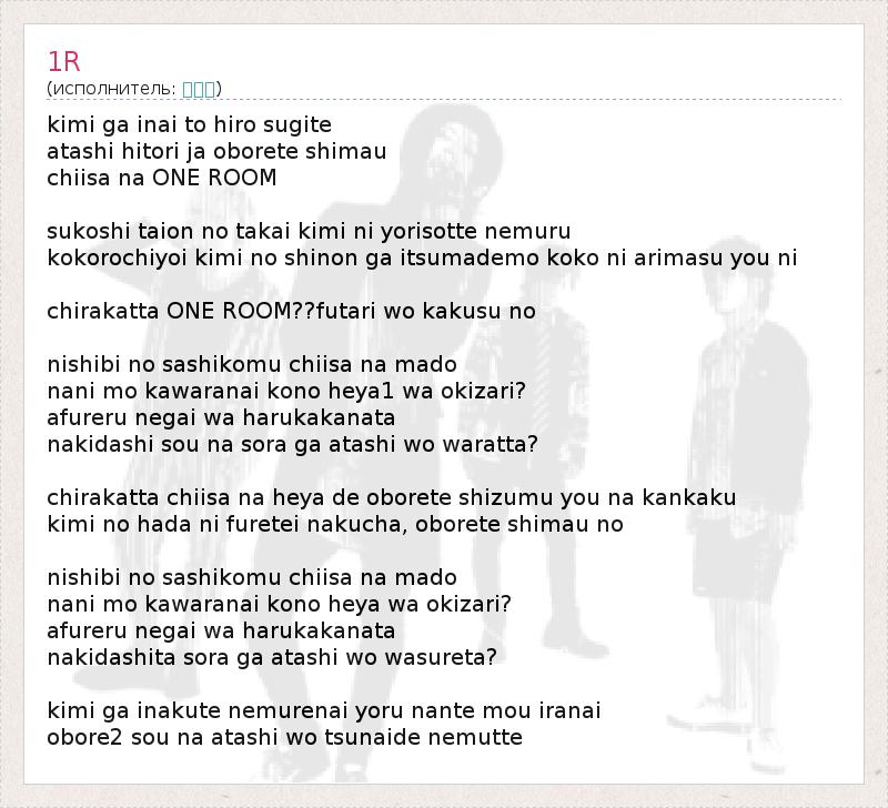 kimi ga inai to hiro sugite atashi hitori ja oborete shimau chiisa na ONE ROOM sukoshi taion no takai kimi ni yorisotte nemuru kokorochiyoi kimi no shinon ga itsumademo koko ni arimasu you ni chirakatta ONE ROOM??futari wo kakusu no nishibi no sashikomu chiisa na mado nani mo kawaranai kono heya1 wa okizari? afureru negai wa harukakanata nakidashi sou na sora ga atashi wo waratta? chirakatta chiisa na heya de oborete shizumu you na kankaku kimi no hada ni furetei nakucha, oborete shimau no nishibi no sashikomu chiisa na mado nani mo kawaranai kono heya wa okizari? afureru negai wa harukakanata nakidashita sora ga atashi wo wasureta? kimi ga inakute nemurenai yoru nante mou iranai obore2 sou na atashi wo tsunaide nemutte