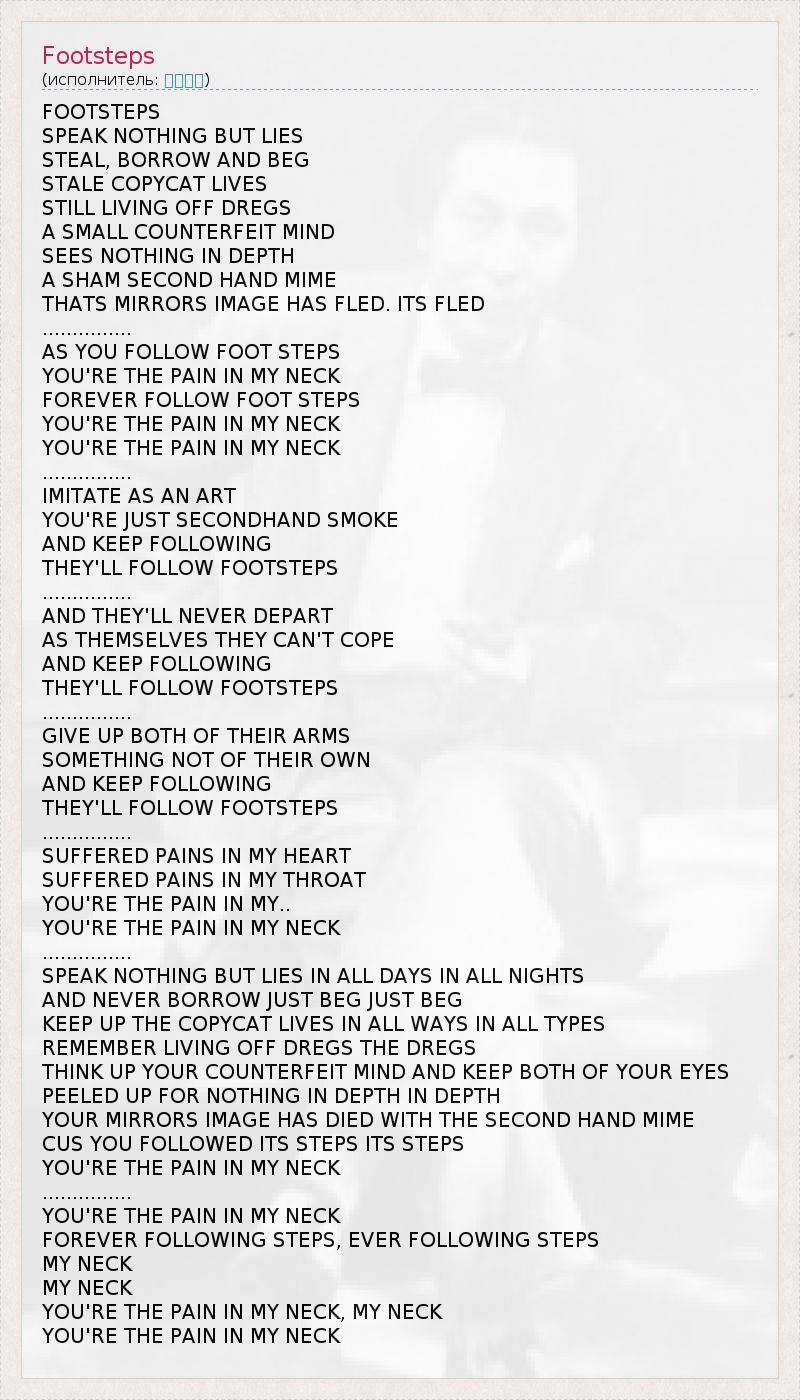 FOOTSTEPS SPEAK NOTHING BUT LIES STEAL, BORROW AND BEG STALE COPYCAT LIVES STILL LIVING OFF DREGS A SMALL COUNTERFEIT MIND SEES NOTHING IN DEPTH A SHAM SECOND HAND MIME THATS MIRRORS IMAGE HAS FLED. ITS FLED ............... AS YOU FOLLOW FOOT STEPS YOU'RE THE PAIN IN MY NECK FOREVER FOLLOW FOOT STEPS YOU'RE THE PAIN IN MY NECK YOU'RE THE PAIN IN MY NECK ............... IMITATE AS AN ART YOU'RE JUST SECONDHAND SMOKE AND KEEP FOLLOWING THEY'LL FOLLOW FOOTSTEPS ............... AND THEY'LL NEVER DEPART AS THEMSELVES THEY CAN'T COPE AND KEEP FOLLOWING THEY'LL FOLLOW FOOTSTEPS ............... GIVE UP BOTH OF THEIR ARMS SOMETHING NOT OF THEIR OWN AND KEEP FOLLOWING THEY'LL FOLLOW FOOTSTEPS ............... SUFFERED PAINS IN MY HEART SUFFERED PAINS IN MY THROAT YOU'RE THE PAIN IN MY.. YOU'RE THE PAIN IN MY NECK ............... SPEAK NOTHING BUT LIES IN ALL DAYS IN ALL NIGHTS AND NEVER BORROW JUST BEG JUST BEG KEEP UP THE COPYCAT LIVES IN ALL WAYS IN ALL TYPES REMEMBER LIVING OFF DREGS THE DREGS THINK UP YOUR COUNTERFEIT MIND AND KEEP BOTH OF YOUR EYES PEELED UP FOR NOTHING IN DEPTH IN DEPTH YOUR MIRRORS IMAGE HAS DIED WITH THE SECOND HAND MIME CUS YOU FOLLOWED ITS STEPS ITS STEPS YOU'RE THE PAIN IN MY NECK ............... YOU'RE THE PAIN IN MY NECK FOREVER FOLLOWING STEPS, EVER FOLLOWING STEPS MY NECK MY NECK YOU'RE THE PAIN IN MY NECK, MY NECK YOU'RE THE PAIN IN MY NECK