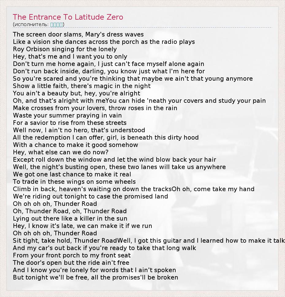 The screen door slams, Mary's dress waves Like a vision she dances across the porch as the radio plays Roy Orbison singing for the lonely Hey, that's me and I want you to only Don't turn me home again, I just can't face myself alone again Don't run back inside, darling, you know just what I'm here for So you're scared and you're thinking that maybe we ain't that young anymore Show a little faith, there's magic in the night You ain't a beauty but, hey, you're alright Oh, and that's alright with meYou can hide 'neath your covers and study your pain Make crosses from your lovers, throw roses in the rain Waste your summer praying in vain For a savior to rise from these streets Well now, I ain't no hero, that's understood All the redemption I can offer, girl, is beneath this dirty hood With a chance to make it good somehow Hey, what else can we do now? Except roll down the window and let the wind blow back your hair Well, the night's busting open, these two lanes will take us anywhere We got one last chance to make it real To trade in these wings on some wheels Climb in back, heaven's waiting on down the tracksOh oh, come take my hand We're riding out tonight to case the promised land Oh oh oh oh, Thunder Road Oh, Thunder Road, oh, Thunder Road Lying out there like a killer in the sun Hey, I know it's late, we can make it if we run Oh oh oh oh, Thunder Road Sit tight, take hold, Thunder RoadWell, I got this guitar and I learned how to make it talk And my car's out back if you're ready to take that long walk From your front porch to my front seat The door's open but the ride ain't free And I know you're lonely for words that I ain't spoken But tonight we'll be free, all the promises'll be broken