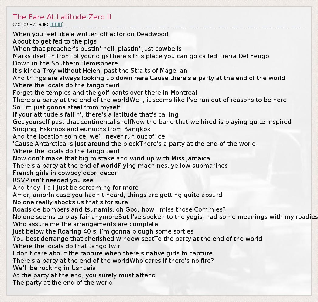 А как ты думаешь, о чем песня "The Fare At Latitude Zero II" ?