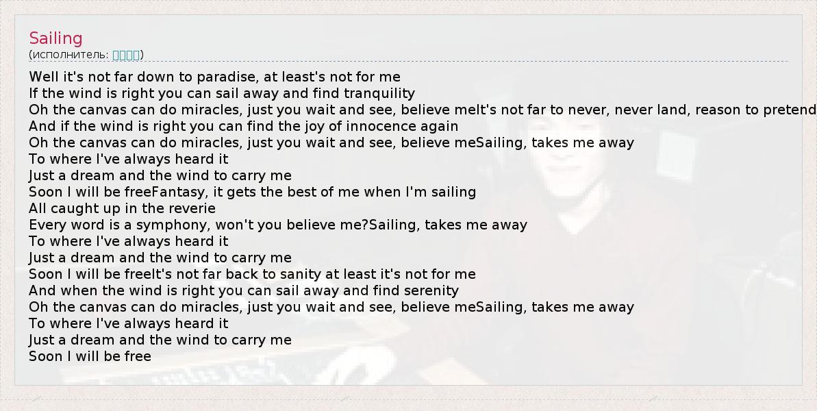 Well it's not far down to paradise, at least's not for me If the wind is right you can sail away and find tranquility Oh the canvas can do miracles, just you wait and see, believe meIt's not far to never, never land, reason to pretend And if the wind is right you can find the joy of innocence again Oh the canvas can do miracles, just you wait and see, believe meSailing, takes me away To where I've always heard it Just a dream and the wind to carry me Soon I will be freeFantasy, it gets the best of me when I'm sailing All caught up in the reverie Every word is a symphony, won't you believe me?Sailing, takes me away To where I've always heard it Just a dream and the wind to carry me Soon I will be freeIt's not far back to sanity at least it's not for me And when the wind is right you can sail away and find serenity Oh the canvas can do miracles, just you wait and see, believe meSailing, takes me away To where I've always heard it Just a dream and the wind to carry me Soon I will be free