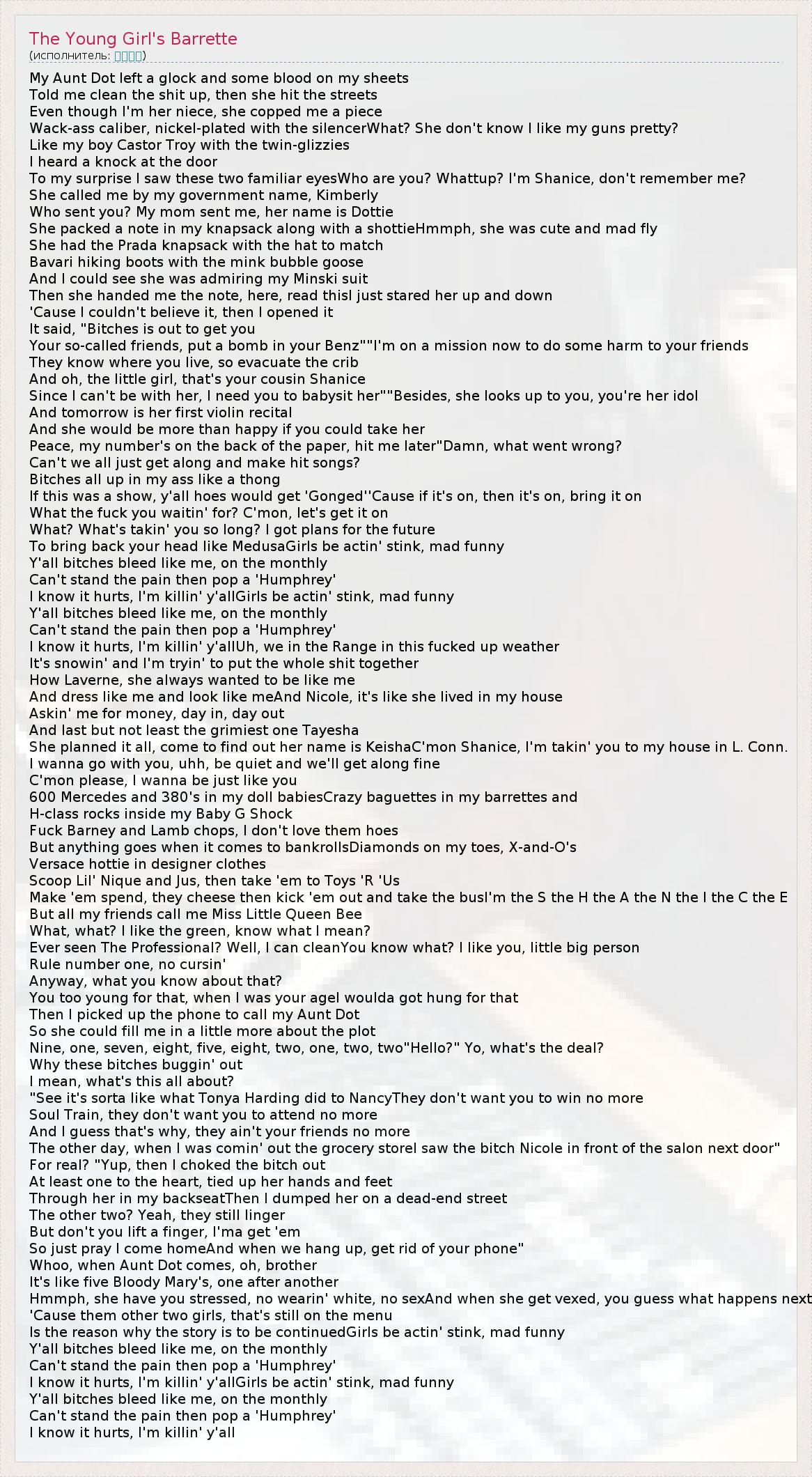 My Aunt Dot left a glock and some blood on my sheets Told me clean the shit up, then she hit the streets Even though I'm her niece, she copped me a piece Wack-ass caliber, nickel-plated with the silencerWhat? She don't know I like my guns pretty? Like my boy Castor Troy with the twin-glizzies I heard a knock at the door To my surprise I saw these two familiar eyesWho are you? Whattup? I'm Shanice, don't remember me? She called me by my government name, Kimberly Who sent you? My mom sent me, her name is Dottie She packed a note in my knapsack along with a shottieHmmph, she was cute and mad fly She had the Prada knapsack with the hat to match Bavari hiking boots with the mink bubble goose And I could see she was admiring my Minski suit Then she handed me the note, here, read thisI just stared her up and down 'Cause I couldn't believe it, then I opened it It said, "Bitches is out to get you Your so-called friends, put a bomb in your Benz""I'm on a mission now to do some harm to your friends They know where you live, so evacuate the crib And oh, the little girl, that's your cousin Shanice Since I can't be with her, I need you to babysit her""Besides, she looks up to you, you're her idol And tomorrow is her first violin recital And she would be more than happy if you could take her Peace, my number's on the back of the paper, hit me later"Damn, what went wrong? Can't we all just get along and make hit songs? Bitches all up in my ass like a thong If this was a show, y'all hoes would get 'Gonged''Cause if it's on, then it's on, bring it on What the fuck you waitin' for? C'mon, let's get it on What? What's takin' you so long? I got plans for the future To bring back your head like MedusaGirls be actin' stink, mad funny Y'all bitches bleed like me, on the monthly Can't stand the pain then pop a 'Humphrey' I know it hurts, I'm killin' y'allGirls be actin' stink, mad funny Y'all bitches bleed like me, on the monthly Can't stand the pain then pop a 'Humphrey' I know it hurts, I'm killin' y'allUh, we in the Range in this fucked up weather It's snowin' and I'm tryin' to put the whole shit together How Laverne, she always wanted to be like me And dress like me and look like meAnd Nicole, it's like she lived in my house Askin' me for money, day in, day out And last but not least the grimiest one Tayesha She planned it all, come to find out her name is KeishaC'mon Shanice, I'm takin' you to my house in L. Conn. I wanna go with you, uhh, be quiet and we'll get along fine C'mon please, I wanna be just like you 600 Mercedes and 380's in my doll babiesCrazy baguettes in my barrettes and H-class rocks inside my Baby G Shock Fuck Barney and Lamb chops, I don't love them hoes But anything goes when it comes to bankrollsDiamonds on my toes, X-and-O's Versace hottie in designer clothes Scoop Lil' Nique and Jus, then take 'em to Toys 'R 'Us Make 'em spend, they cheese then kick 'em out and take the busI'm the S the H the A the N the I the C the E But all my friends call me Miss Little Queen Bee What, what? I like the green, know what I mean? Ever seen The Professional? Well, I can cleanYou know what? I like you, little big person Rule number one, no cursin' Anyway, what you know about that? You too young for that, when I was your ageI woulda got hung for that Then I picked up the phone to call my Aunt Dot So she could fill me in a little more about the plot Nine, one, seven, eight, five, eight, two, one, two, two"Hello?" Yo, what's the deal? Why these bitches buggin' out I mean, what's this all about? "See it's sorta like what Tonya Harding did to NancyThey don't want you to win no more Soul Train, they don't want you to attend no more And I guess that's why, they ain't your friends no more The other day, when I was comin' out the grocery storeI saw the bitch Nicole in front of the salon next door" For real? "Yup, then I choked the bitch out At least one to the heart, tied up her hands and feet Through her in my backseatThen I dumped her on a dead-end street The other two? Yeah, they still linger But don't you lift a finger, I'ma get 'em So just pray I come homeAnd when we hang up, get rid of your phone" Whoo, when Aunt Dot comes, oh, brother It's like five Bloody Mary's, one after another Hmmph, she have you stressed, no wearin' white, no sexAnd when she get vexed, you guess what happens next 'Cause them other two girls, that's still on the menu Is the reason why the story is to be continuedGirls be actin' stink, mad funny Y'all bitches bleed like me, on the monthly Can't stand the pain then pop a 'Humphrey' I know it hurts, I'm killin' y'allGirls be actin' stink, mad funny Y'all bitches bleed like me, on the monthly Can't stand the pain then pop a 'Humphrey' I know it hurts, I'm killin' y'all