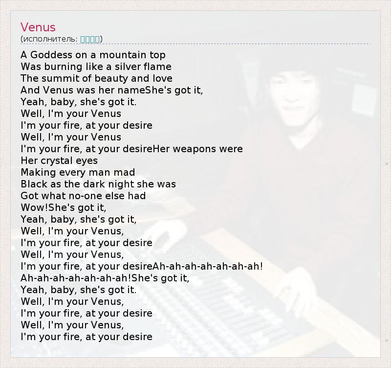A Goddess on a mountain top Was burning like a silver flame The summit of beauty and love And Venus was her nameShe's got it, Yeah, baby, she's got it. Well, I'm your Venus I'm your fire, at your desire Well, I'm your Venus I'm your fire, at your desireHer weapons were Her crystal eyes Making every man mad Black as the dark night she was Got what no-one else had Wow!She's got it, Yeah, baby, she's got it, Well, I'm your Venus, I'm your fire, at your desire Well, I'm your Venus, I'm your fire, at your desireAh-ah-ah-ah-ah-ah-ah! Ah-ah-ah-ah-ah-ah-ah!She's got it, Yeah, baby, she's got it. Well, I'm your Venus, I'm your fire, at your desire Well, I'm your Venus, I'm your fire, at your desire