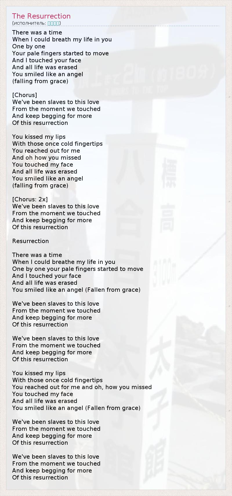 There was a time When I could breath my life in you One by one Your pale fingers started to move And I touched your face And all life was erased You smiled like an angel (falling from grace) [Chorus] We've been slaves to this love From the moment we touched And keep begging for more Of this resurrection You kissed my lips With those once cold fingertips You reached out for me And oh how you missed You touched my face And all life was erased You smiled like an angel (falling from grace) [Chorus: 2х] We've been slaves to this love From the moment we touched And keep begging for more Of this resurrection Resurrection There was a time When I could breathe my life in you One by one your pale fingers started to move And I touched your face And all life was erased You smiled like an angel (Fallen from grace) We've been slaves to this love From the moment we touched And keep begging for more Of this resurrection We've been slaves to this love From the moment we touched And keep begging for more Of this resurrection You kissed my lips With those once cold fingertips You reached out for me and oh, how you missed You touched my face And all life was erased You smiled like an angel (Fallen from grace) We've been slaves to this love From the moment we touched And keep begging for more Of this resurrection We've been slaves to this love From the moment we touched And keep begging for more Of this resurrection