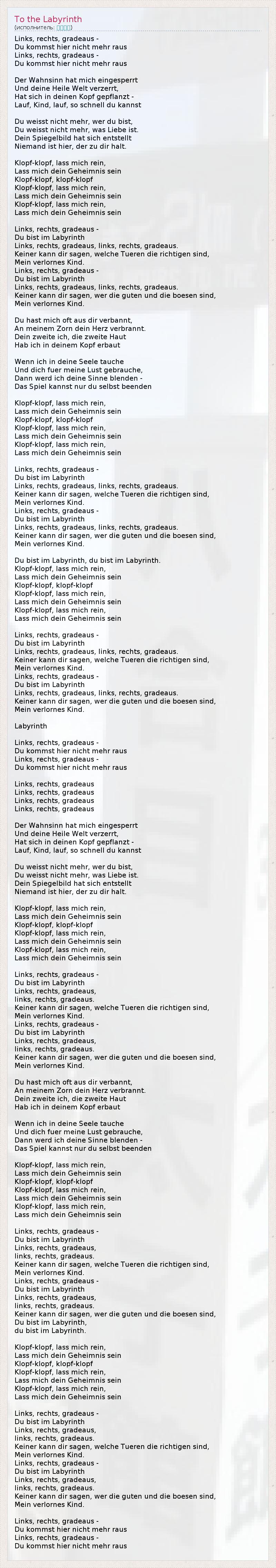 Links, rechts, gradeaus - Du kommst hier nicht mehr raus Links, rechts, gradeaus - Du kommst hier nicht mehr raus Der Wahnsinn hat mich eingesperrt Und deine Heile Welt verzerrt, Hat sich in deinen Kopf gepflanzt - Lauf, Kind, lauf, so schnell du kannst Du weisst nicht mehr, wer du bist, Du weisst nicht mehr, was Liebe ist. Dein Spiegelbild hat sich entstellt Niemand ist hier, der zu dir halt. Klopf-klopf, lass mich rein, Lass mich dein Geheimnis sein Klopf-klopf, klopf-klopf Klopf-klopf, lass mich rein, Lass mich dein Geheimnis sein Klopf-klopf, lass mich rein, Lass mich dein Geheimnis sein Links, rechts, gradeaus - Du bist im Labyrinth Links, rechts, gradeaus, links, rechts, gradeaus. Keiner kann dir sagen, welche Tueren die richtigen sind, Mein verlornes Kind. Links, rechts, gradeaus - Du bist im Labyrinth Links, rechts, gradeaus, links, rechts, gradeaus. Keiner kann dir sagen, wer die guten und die boesen sind, Mein verlornes Kind. Du hast mich oft aus dir verbannt, An meinem Zorn dein Herz verbrannt. Dein zweite ich, die zweite Haut Hab ich in deinem Kopf erbaut Wenn ich in deine Seele tauche Und dich fuer meine Lust gebrauche, Dann werd ich deine Sinne blenden - Das Spiel kannst nur du selbst beenden Klopf-klopf, lass mich rein, Lass mich dein Geheimnis sein Klopf-klopf, klopf-klopf Klopf-klopf, lass mich rein, Lass mich dein Geheimnis sein Klopf-klopf, lass mich rein, Lass mich dein Geheimnis sein Links, rechts, gradeaus - Du bist im Labyrinth Links, rechts, gradeaus, links, rechts, gradeaus. Keiner kann dir sagen, welche Tueren die richtigen sind, Mein verlornes Kind. Links, rechts, gradeaus - Du bist im Labyrinth Links, rechts, gradeaus, links, rechts, gradeaus. Keiner kann dir sagen, wer die guten und die boesen sind, Mein verlornes Kind. Du bist im Labyrinth, du bist im Labyrinth. Klopf-klopf, lass mich rein, Lass mich dein Geheimnis sein Klopf-klopf, klopf-klopf Klopf-klopf, lass mich rein, Lass mich dein Geheimnis sein Klopf-klopf, lass mich rein, Lass mich dein Geheimnis sein Links, rechts, gradeaus - Du bist im Labyrinth Links, rechts, gradeaus, links, rechts, gradeaus. Keiner kann dir sagen, welche Tueren die richtigen sind, Mein verlornes Kind. Links, rechts, gradeaus - Du bist im Labyrinth Links, rechts, gradeaus, links, rechts, gradeaus. Keiner kann dir sagen, wer die guten und die boesen sind, Mein verlornes Kind. Labyrinth Links, rechts, gradeaus - Du kommst hier nicht mehr raus Links, rechts, gradeaus - Du kommst hier nicht mehr raus Links, rechts, gradeaus Links, rechts, gradeaus Links, rechts, gradeaus Links, rechts, gradeaus Der Wahnsinn hat mich eingesperrt Und deine Heile Welt verzerrt, Hat sich in deinen Kopf gepflanzt - Lauf, Kind, lauf, so schnell du kannst Du weisst nicht mehr, wer du bist, Du weisst nicht mehr, was Liebe ist. Dein Spiegelbild hat sich entstellt Niemand ist hier, der zu dir halt. Klopf-klopf, lass mich rein, Lass mich dein Geheimnis sein Klopf-klopf, klopf-klopf Klopf-klopf, lass mich rein, Lass mich dein Geheimnis sein Klopf-klopf, lass mich rein, Lass mich dein Geheimnis sein Links, rechts, gradeaus - Du bist im Labyrinth Links, rechts, gradeaus, links, rechts, gradeaus. Keiner kann dir sagen, welche Tueren die richtigen sind, Mein verlornes Kind. Links, rechts, gradeaus - Du bist im Labyrinth Links, rechts, gradeaus, links, rechts, gradeaus. Keiner kann dir sagen, wer die guten und die boesen sind, Mein verlornes Kind. Du hast mich oft aus dir verbannt, An meinem Zorn dein Herz verbrannt. Dein zweite ich, die zweite Haut Hab ich in deinem Kopf erbaut Wenn ich in deine Seele tauche Und dich fuer meine Lust gebrauche, Dann werd ich deine Sinne blenden - Das Spiel kannst nur du selbst beenden Klopf-klopf, lass mich rein, Lass mich dein Geheimnis sein Klopf-klopf, klopf-klopf Klopf-klopf, lass mich rein, Lass mich dein Geheimnis sein Klopf-klopf, lass mich rein, Lass mich dein Geheimnis sein Links, rechts, gradeaus - Du bist im Labyrinth Links, rechts, gradeaus, links, rechts, gradeaus. Keiner kann dir sagen, welche Tueren die richtigen sind, Mein verlornes Kind. Links, rechts, gradeaus - Du bist im Labyrinth Links, rechts, gradeaus, links, rechts, gradeaus. Keiner kann dir sagen, wer die guten und die boesen sind, Du bist im Labyrinth, du bist im Labyrinth. Klopf-klopf, lass mich rein, Lass mich dein Geheimnis sein Klopf-klopf, klopf-klopf Klopf-klopf, lass mich rein, Lass mich dein Geheimnis sein Klopf-klopf, lass mich rein, Lass mich dein Geheimnis sein Links, rechts, gradeaus - Du bist im Labyrinth Links, rechts, gradeaus, links, rechts, gradeaus. Keiner kann dir sagen, welche Tueren die richtigen sind, Mein verlornes Kind. Links, rechts, gradeaus - Du bist im Labyrinth Links, rechts, gradeaus, links, rechts, gradeaus. Keiner kann dir sagen, wer die guten und die boesen sind, Mein verlornes Kind. Links, rechts, gradeaus - Du kommst hier nicht mehr raus Links, rechts, gradeaus - Du kommst hier nicht mehr raus