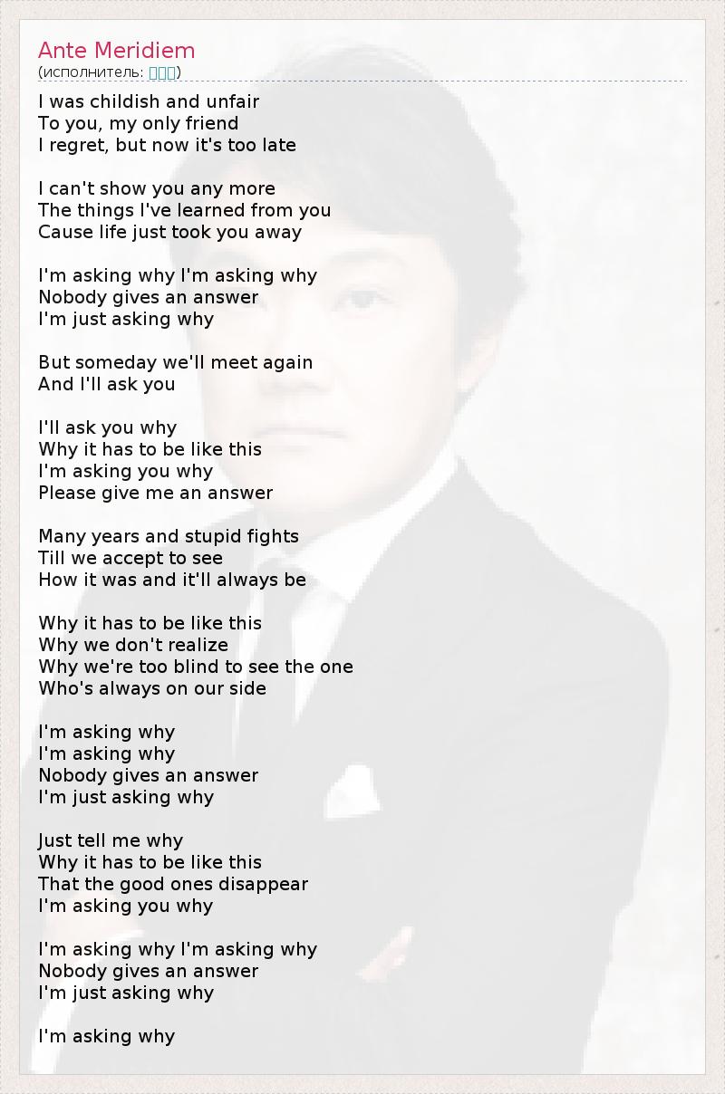Я был инфантилен и несправедлив К тебе, мой единственный друг, Я сожалею, но теперь слишком поздно Я больше не могу показать тебе вещи, Которые я усвоил благодаря тебе, Потому что жизнь просто забрала тебя Я спрашиваю "Почему", я спрашиваю "Почему", Никто мне не отвечает, Я просто спрашиваю "Почему" Но однажды мы встретимся вновь, И я спрошу тебя Я спрошу тебя "Почему, Почему это должно быть именно так?" Я спрашиваю тебя "Почему?" Пожалуйста, ответь мне Столько лет бестолковой борьбы, Пока мы наконец не признали, Как это было и как всегда будет Почему это должно быть именно так, Почему мы не этого не понимаем? Почему мы настолько слепы и не видим того, Кто всегда на нашей стороне? Я спрашиваю "Почему" Я спрашиваю "Почему", Никто мне не отвечает, Я просто спрашиваю "Почему" Просто скажи мне "Почему, Почему все должно быть именно так - Почему лучшие люди всегда уходят? Я спрашиваю "Почему" Я спрашиваю "Почему", я спрашиваю "Почему", Никто мне не отвечает, Я просто спрашиваю "Почему" Я спрашиваю "Почему"