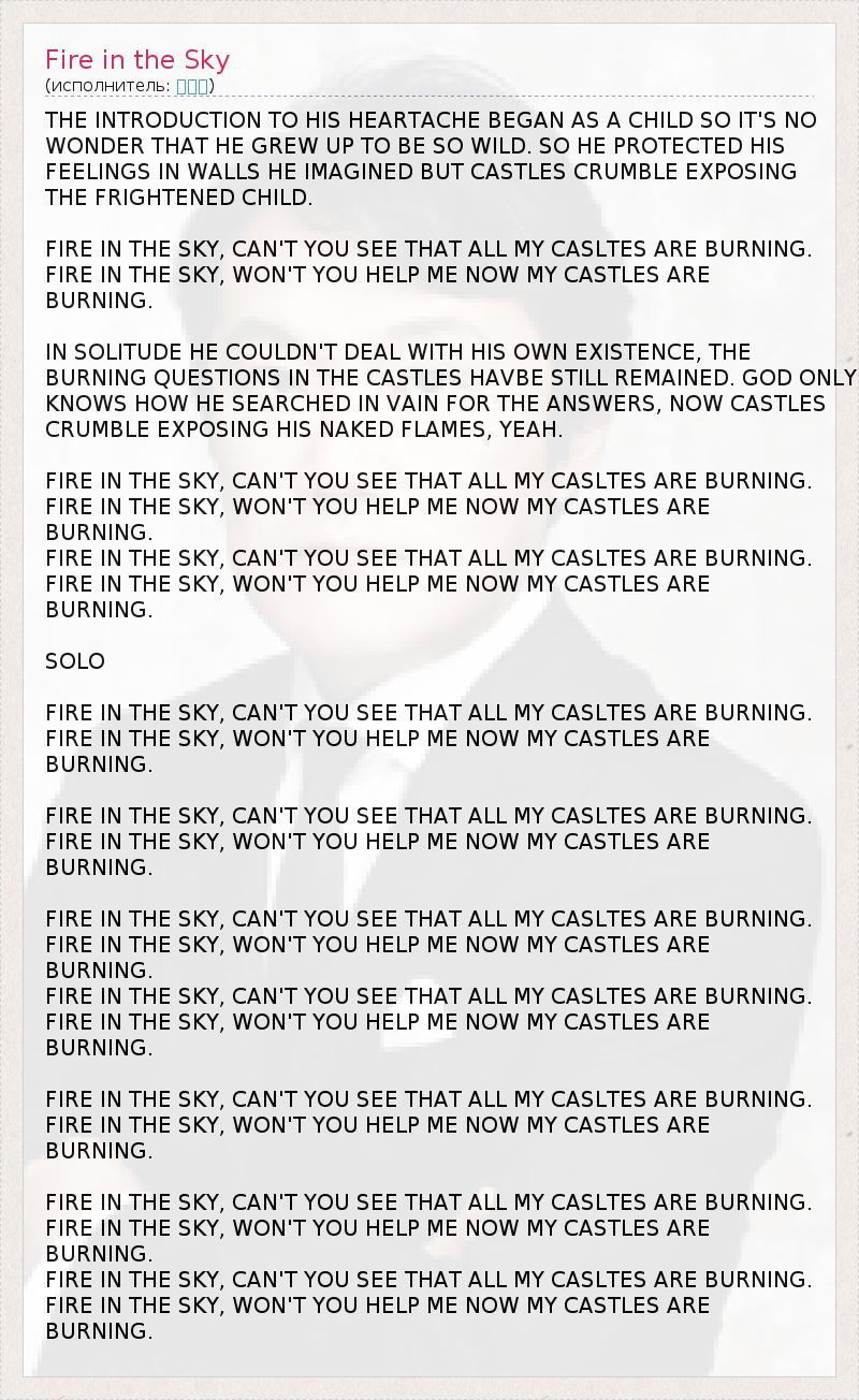 THE INTRODUCTION TO HIS HEARTACHE BEGAN AS A CHILD SO IT'S NO WONDER THAT HE GREW UP TO BE SO WILD. SO HE PROTECTED HIS FEELINGS IN WALLS HE IMAGINED BUT CASTLES CRUMBLE EXPOSING THE FRIGHTENED CHILD. FIRE IN THE SKY, CAN'T YOU SEE THAT ALL MY CASLTES ARE BURNING. FIRE IN THE SKY, WON'T YOU HELP ME NOW MY CASTLES ARE BURNING. IN SOLITUDE HE COULDN'T DEAL WITH HIS OWN EXISTENCE, THE BURNING QUESTIONS IN THE CASTLES HAVBE STILL REMAINED. GOD ONLY KNOWS HOW HE SEARCHED IN VAIN FOR THE ANSWERS, NOW CASTLES CRUMBLE EXPOSING HIS NAKED FLAMES, YEAH. FIRE IN THE SKY, CAN'T YOU SEE THAT ALL MY CASLTES ARE BURNING. FIRE IN THE SKY, WON'T YOU HELP ME NOW MY CASTLES ARE BURNING. FIRE IN THE SKY, CAN'T YOU SEE THAT ALL MY CASLTES ARE BURNING. FIRE IN THE SKY, WON'T YOU HELP ME NOW MY CASTLES ARE BURNING. SOLO FIRE IN THE SKY, CAN'T YOU SEE THAT ALL MY CASLTES ARE BURNING. FIRE IN THE SKY, WON'T YOU HELP ME NOW MY CASTLES ARE BURNING. FIRE IN THE SKY, CAN'T YOU SEE THAT ALL MY CASLTES ARE BURNING. FIRE IN THE SKY, WON'T YOU HELP ME NOW MY CASTLES ARE BURNING. FIRE IN THE SKY, CAN'T YOU SEE THAT ALL MY CASLTES ARE BURNING. FIRE IN THE SKY, WON'T YOU HELP ME NOW MY CASTLES ARE BURNING. FIRE IN THE SKY, CAN'T YOU SEE THAT ALL MY CASLTES ARE BURNING. FIRE IN THE SKY, WON'T YOU HELP ME NOW MY CASTLES ARE BURNING. FIRE IN THE SKY, CAN'T YOU SEE THAT ALL MY CASLTES ARE BURNING. FIRE IN THE SKY, WON'T YOU HELP ME NOW MY CASTLES ARE BURNING. FIRE IN THE SKY, CAN'T YOU SEE THAT ALL MY CASLTES ARE BURNING. FIRE IN THE SKY, WON'T YOU HELP ME NOW MY CASTLES ARE BURNING. FIRE IN THE SKY, CAN'T YOU SEE THAT ALL MY CASLTES ARE BURNING. FIRE IN THE SKY, WON'T YOU HELP ME NOW MY CASTLES ARE BURNING.