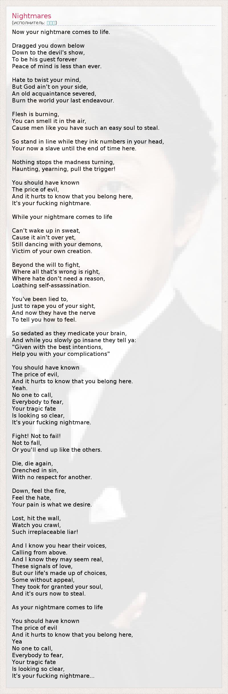 Сейчас твой кошмар оживает... Тебя затянули вниз, Прямо на шоу к дьяволу, Чтобы ты навсегда стал его гостем. Тебе никогда не было так неспокойно на душе. Я не хочу крутить тебе мозги, Но Бог не на твоей стороне. Старая связь разорвана, Спалить мир дотла - твоя последняя попытка. Плоть горит, Ты чувствуешь этот запах в воздухе, Потому что у людей как ты так просто украсть душу. Так стой в ряду, пока тебе не выжгут клеймо на лбу, Теперь ты раб здесь до конца времен. Ничто не может остановить безумие - Навязчивое, непреодолимое... Тяни переключатель! Ты должен был знать Цену зла, И тебе больно осознавать, что ты здесь останешься, Это твой сущий кошмар. Пока твой кошмар оживает... Не можешь проснуться в холодном поту, Потому что это ещё не закончилось. Всё ещё танцуешь с демонами, Своими руками сотворив из себя жертву. Помимо воли к борьбе, Где всё, что ложно - верно, Где на ненависть не нужно причин, Ты ненавидишь идею самоубийства. Тебе врали Лишь для того, чтобы лишить зрения, И сейчас они имеют наглость Указывать тебе, что чувствовать. Успокоение наступает, когда твой мозг накачивают лекарствами. И пока ты медленно становишься безумцем, тебе говорят: "Вооружившись самыми лучшими намерениями, Мы поможем вам с любыми трудностями!" Ты должен был знать Цену зла, И тебе больно осознавать, что ты здесь останешься, Да. Некого звать, Всех нужно бояться. Твоя трагичная судьба Как на ладони - Это твой сущий кошмар. Бороться! Не ошибаться! Не падать, Или ты закончишь, как остальные. Умирай снова и снова, Насквозь пропитанный грехом, Без уважения к остальным. Ниже, почувствуй огонь, Почувствуй ненависть, Твоя боль - всё, что мы желаем. Потерянный, бьёшься об стены, Мы следим за твоим пресмыкательством, Неисправимый лжец! Я знаю, ты слышишь их голоса, Зовущие свыше. Я знаю, что они кажутся реальными, Эти посылы любви. Но наша жизнь - цепочка решений, Иногда абсолютно бессмысленных. Твоя душа была данностью, Ну а теперь мы ее заберём. Как будто твой кошмар оживает... Ты должен был знать Цену зла, И тебе больно осознавать, что ты здесь останешься, Да. Некого звать, Всех нужно бояться. Твоя трагичная судьба Как на ладони - Это твой сущий кошмар...