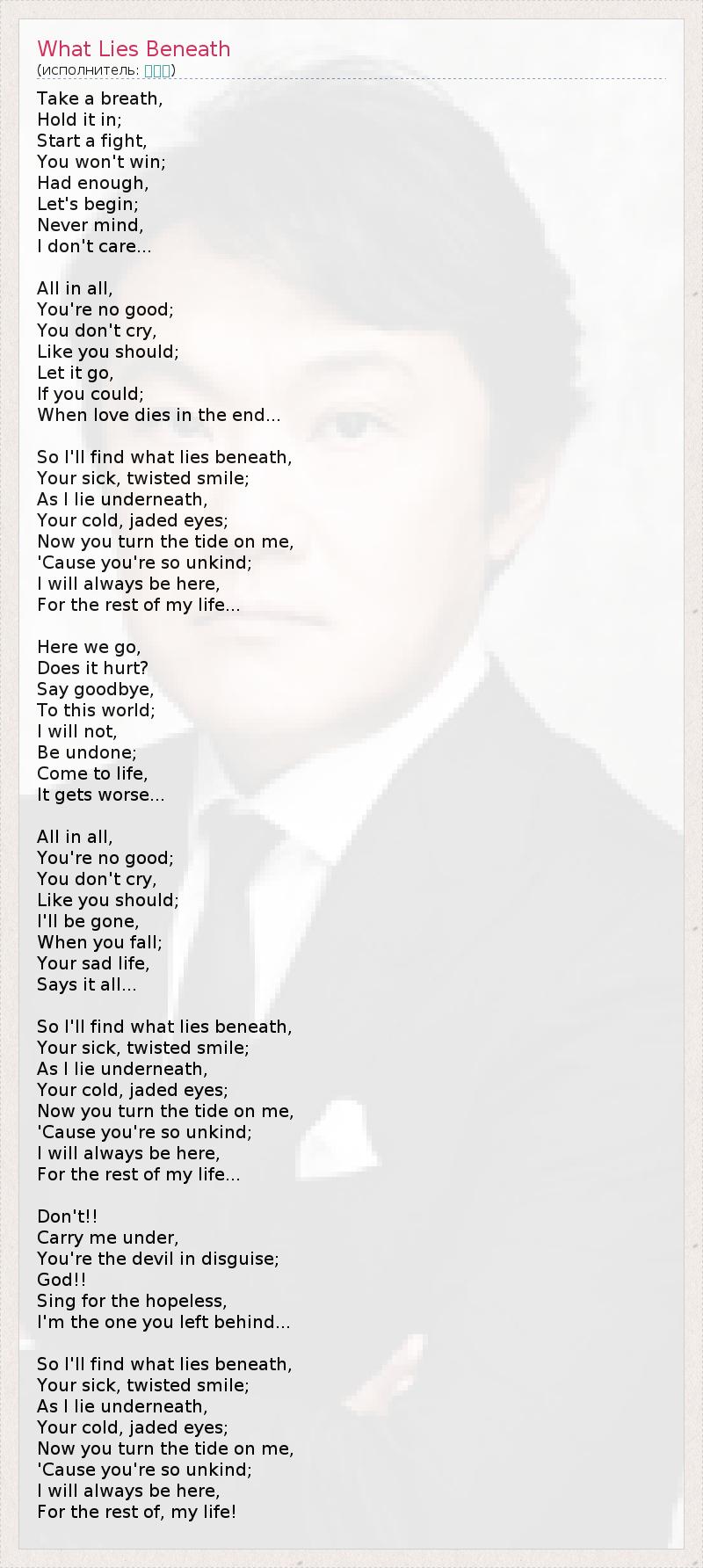 Take a breath, Hold it in; Start a fight, You won't win; Had enough, Let's begin; Never mind, I don't care... All in all, You're no good; You don't cry, Like you should; Let it go, If you could; When love dies in the end... So I'll find what lies beneath, Your sick, twisted smile; As I lie underneath, Your cold, jaded eyes; Now you turn the tide on me, 'Cause you're so unkind; I will always be here, For the rest of my life... Here we go, Does it hurt? Say goodbye, To this world; I will not, Be undone; Come to life, It gets worse... All in all, You're no good; You don't cry, Like you should; I'll be gone, When you fall; Your sad life, Says it all... So I'll find what lies beneath, Your sick, twisted smile; As I lie underneath, Your cold, jaded eyes; Now you turn the tide on me, 'Cause you're so unkind; I will always be here, For the rest of my life... Don't!! Carry me under, You're the devil in disguise; God!! Sing for the hopeless, I'm the one you left behind... So I'll find what lies beneath, Your sick, twisted smile; As I lie underneath, Your cold, jaded eyes; Now you turn the tide on me, 'Cause you're so unkind; I will always be here, For the rest of, my life!