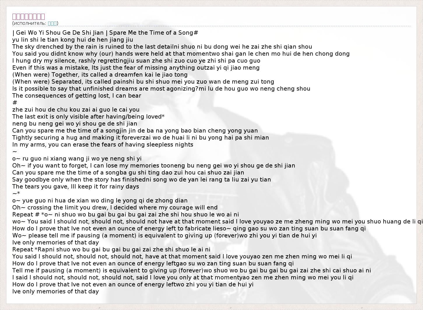 | Gei Wo Yi Shou Ge De Shi Jian | Spare Me the Time of a Song# yu lin shi le tian kong hui de hen jiang jiu The sky drenched by the rain is ruined to the last detailni shuo ni bu dong wei he zai zhe shi qian shou You said you didnt know why (our) hands were held at that momentwo shai gan le chen mo hui de hen chong dong I hung dry my silence, rashly regrettingjiu suan zhe shi zuo cuo ye zhi shi pa cuo guo Even if this was a mistake, Its just the fear of missing anything outzai yi qi jiao meng (When were) Together, its called a dreamfen kai le jiao tong (When were) Separated, its called painshi bu shi shuo mei you zuo wan de meng zui tong Is it possible to say that unfinished dreams are most agonizing?mi lu de hou guo wo neng cheng shou The consequences of getting lost, I can bear # zhe zui hou de chu kou zai ai guo le cai you The last exit is only visible after having/being loved* neng bu neng gei wo yi shou ge de shi jian Can you spare me the time of a songjin jin de ba na yong bao bian cheng yong yuan Tightly securing a hug and making it foreverzai wo de huai li ni bu yong hai pa shi mian In my arms, you can erase the fears of having sleepless nights ~ o~ ru guo ni xiang wang ji wo ye neng shi yi Oh~ if you want to forget, I can lose my memories tooneng bu neng gei wo yi shou ge de shi jian Can you spare me the time of a songba gu shi ting dao zui hou cai shuo zai jian Say goodbye only when the story has finishedni song wo de yan lei rang ta liu zai yu tian The tears you gave, Ill keep it for rainy days ~* o~ yue guo ni hua de xian wo ding le yong qi de zhong dian Oh~ crossing the limit you drew, I decided where my courage will end Repeat # *o~ ni shuo wo bu gai bu gai bu gai zai zhe shi hou shuo le wo ai ni wo~ You said I should not, should not, should not have at that moment said I love youyao ze me zheng ming wo mei you shuo huang de li qi How do I prove that Ive not even an ounce of energy left to fabricate lieso~ qing gao su wo zan ting suan bu suan fang qi Wo~ please tell me if pausing (a moment) is equivalent to giving up (forever)wo zhi you yi tian de hui yi Ive only memories of that day Repeat *Rapni shuo wo bu gai bu gai bu gai zai zhe shi shuo le ai ni You said I should not, should not, should not, have at that moment said I love youyao zen me zhen ming wo mei li qi How do I prove that Ive not even an ounce of energy leftgao su wo zan ting suan bu suan fang qi Tell me if pausing (a moment) is equivalent to giving up (forever)wo shuo wo bu gai bu gai bu gai zai zhe shi cai shuo ai ni I said I should not, should not, should not, said I love you only at that momentyao zen me zhen ming wo mei you li qi How do I prove that Ive not even an ounce of energy leftwo zhi you yi tian de hui yi Ive only memories of that day