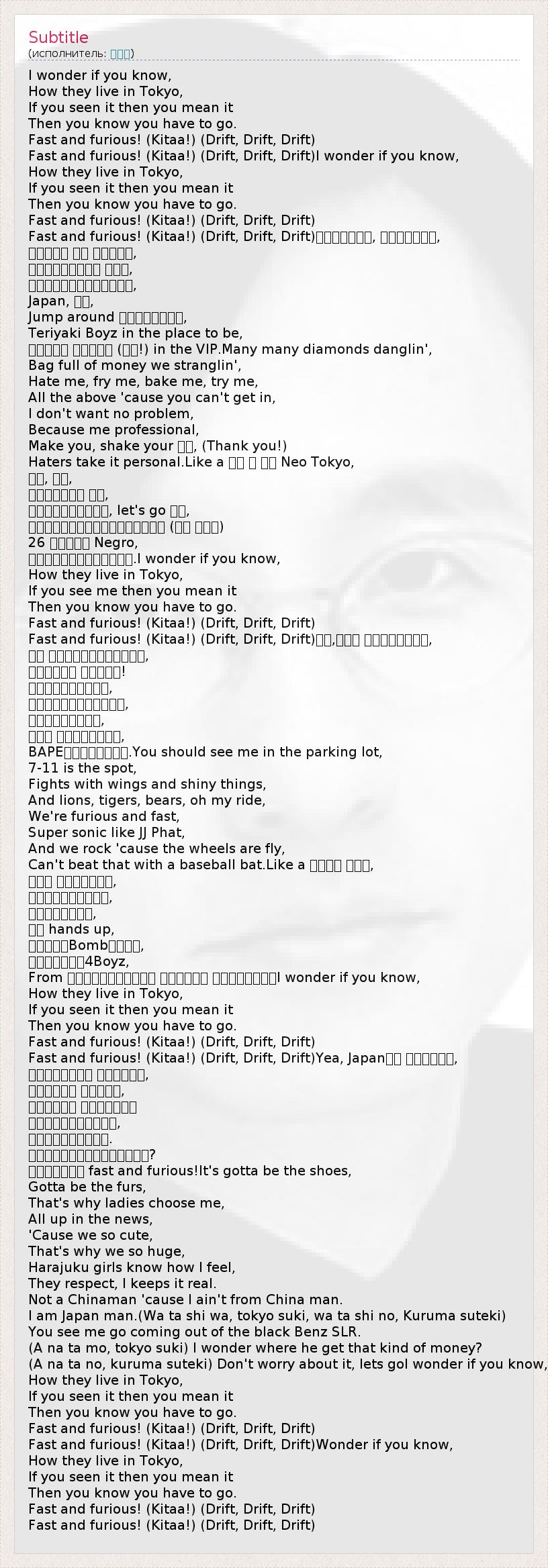 Fast and furious! (Kitaa!) (Drift, Drift, Drift)Yea, Japan毎日 ドキドキです,