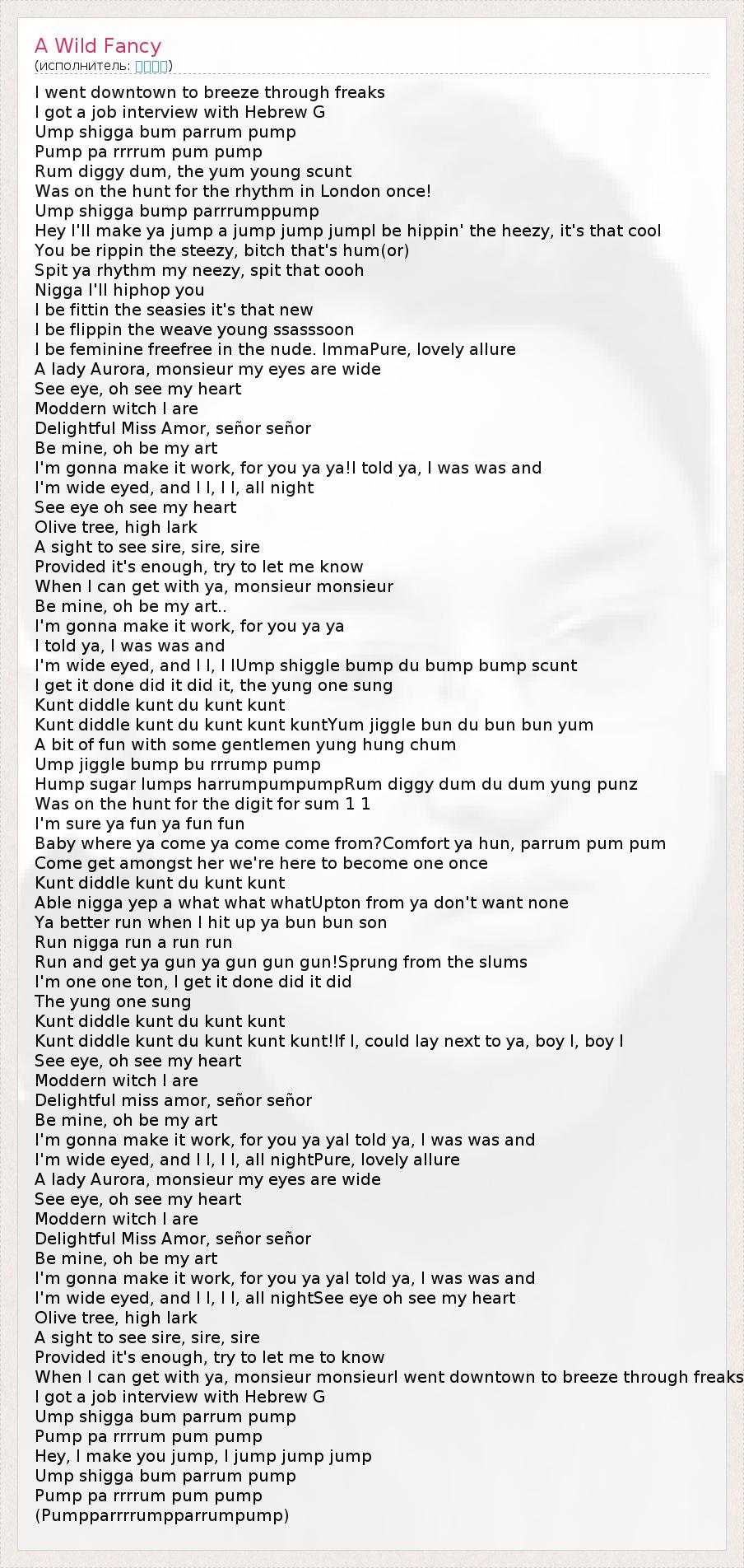 I went downtown to breeze through freaks I got a job interview with Hebrew G Ump shigga bum parrum pump Pump pa rrrrum pum pump Rum diggy dum, the yum young scunt Was on the hunt for the rhythm in London once! Ump shigga bump parrrumppump Hey I'll make ya jump a jump jump jumpI be hippin' the heezy, it's that cool You be rippin the steezy, bitch that's hum(or) Spit ya rhythm my neezy, spit that oooh Nigga I'll hiphop you I be fittin the seasies it's that new I be flippin the weave young ssasssoon I be feminine freefree in the nude. ImmaPure, lovely allure A lady Aurora, monsieur my eyes are wide See eye, oh see my heart Moddern witch I are Delightful Miss Amor, señor señor Be mine, oh be my art I'm gonna make it work, for you ya ya!I told ya, I was was and I'm wide eyed, and I I, I I, all night See eye oh see my heart Olive tree, high lark A sight to see sire, sire, sire Provided it's enough, try to let me know When I can get with ya, monsieur monsieur Be mine, oh be my art.. I'm gonna make it work, for you ya ya I told ya, I was was and I'm wide eyed, and I I, I IUmp shiggle bump du bump bump scunt I get it done did it did it, the yung one sung Kunt diddle kunt du kunt kunt Kunt diddle kunt du kunt kunt kuntYum jiggle bun du bun bun yum A bit of fun with some gentlemen yung hung chum Ump jiggle bump bu rrrump pump Hump sugar lumps harrumpumpumpRum diggy dum du dum yung punz Was on the hunt for the digit for sum 1 1 I'm sure ya fun ya fun fun Baby where ya come ya come come from?Comfort ya hun, parrum pum pum Come get amongst her we're here to become one once Kunt diddle kunt du kunt kunt Able nigga yep a what what whatUpton from ya don't want none Ya better run when I hit up ya bun bun son Run nigga run a run run Run and get ya gun ya gun gun gun!Sprung from the slums I'm one one ton, I get it done did it did The yung one sung Kunt diddle kunt du kunt kunt Kunt diddle kunt du kunt kunt kunt!If I, could lay next to ya, boy I, boy I See eye, oh see my heart Moddern witch I are Delightful miss amor, señor señor Be mine, oh be my art I'm gonna make it work, for you ya yaI told ya, I was was and I'm wide eyed, and I I, I I, all nightPure, lovely allure A lady Aurora, monsieur my eyes are wide See eye, oh see my heart Moddern witch I are Delightful Miss Amor, señor señor Be mine, oh be my art I'm gonna make it work, for you ya yaI told ya, I was was and I'm wide eyed, and I I, I I, all nightSee eye oh see my heart Olive tree, high lark A sight to see sire, sire, sire Provided it's enough, try to let me to know When I can get with ya, monsieur monsieurI went downtown to breeze through freaks I got a job interview with Hebrew G Ump shigga bum parrum pump Pump pa rrrrum pum pump Hey, I make you jump, I jump jump jump Ump shigga bum parrum pump Pump pa rrrrum pum pump (Pumpparrrrumpparrumpump)