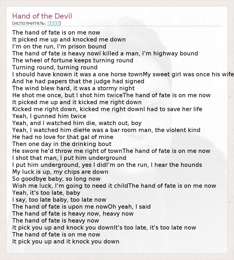 The hand of fate is on me now It picked me up and knocked me down I'm on the run, I'm prison bound The hand of fate is heavy nowI killed a man, I'm highway bound The wheel of fortune keeps turning round Turning round, turning round I should have known it was a one horse townMy sweet girl was once his wife And he had papers that the judge had signed The wind blew hard, it was a stormy night He shot me once, but I shot him twiceThe hand of fate is on me now It picked me up and it kicked me right down Kicked me right down, kicked me right downI had to save her life Yeah, I gunned him twice Yeah, and I watched him die, watch out, boy Yeah, I watched him dieHe was a bar room man, the violent kind He had no love for that gal of mine Then one day in the drinking bout He swore he'd throw me right of townThe hand of fate is on me now I shot that man, I put him underground I put him underground, yes I didI'm on the run, I hear the hounds My luck is up, my chips are down So goodbye baby, so long now Wish me luck, I'm going to need it childThe hand of fate is on me now Yeah, it's too late, baby I say, too late baby, too late now The hand of fate is upon me nowOh yeah, I said The hand of fate is heavy now, heavy now The hand of fate is heavy now It pick you up and knock you downIt's too late, it's too late now The hand of fate is on me now It pick you up and it knock you down