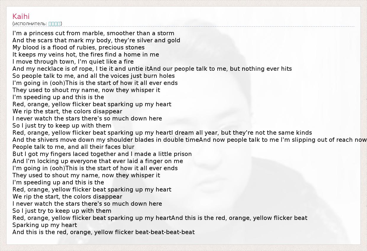 I'm a princess cut from marble, smoother than a storm And the scars that mark my body, they're silver and gold My blood is a flood of rubies, precious stones It keeps my veins hot, the fires find a home in me I move through town, I'm quiet like a fire And my necklace is of rope, I tie it and untie itAnd our people talk to me, but nothing ever hits So people talk to me, and all the voices just burn holes I'm going in (ooh)This is the start of how it all ever ends They used to shout my name, now they whisper it I'm speeding up and this is the Red, orange, yellow flicker beat sparking up my heart We rip the start, the colors disappear I never watch the stars there's so much down here So I just try to keep up with them Red, orange, yellow flicker beat sparking up my heartI dream all year, but they're not the same kinds And the shivers move down my shoulder blades in double timeAnd now people talk to me I'm slipping out of reach now People talk to me, and all their faces blur But I got my fingers laced together and I made a little prison And I'm locking up everyone that ever laid a finger on me I'm going in (ooh)This is the start of how it all ever ends They used to shout my name, now they whisper it I'm speeding up and this is the Red, orange, yellow flicker beat sparking up my heart We rip the start, the colors disappear I never watch the stars there's so much down here So I just try to keep up with them Red, orange, yellow flicker beat sparking up my heartAnd this is the red, orange, yellow flicker beat Sparking up my heart And this is the red, orange, yellow flicker beat-beat-beat-beat