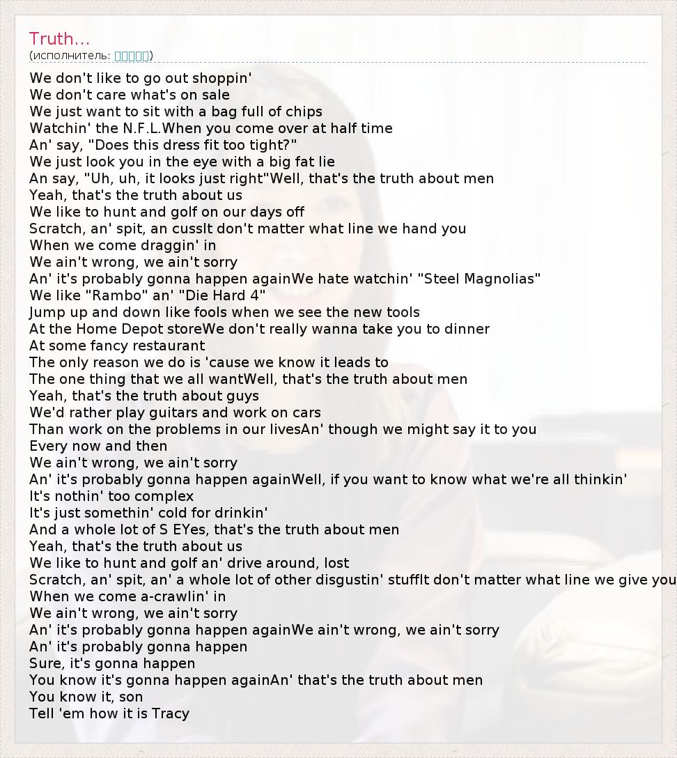 We don't like to go out shoppin' We don't care what's on sale We just want to sit with a bag full of chips Watchin' the N.F.L.When you come over at half time An' say, "Does this dress fit too tight?" We just look you in the eye with a big fat lie An say, "Uh, uh, it looks just right"Well, that's the truth about men Yeah, that's the truth about us We like to hunt and golf on our days off Scratch, an' spit, an cussIt don't matter what line we hand you When we come draggin' in We ain't wrong, we ain't sorry An' it's probably gonna happen againWe hate watchin' "Steel Magnolias" We like "Rambo" an' "Die Hard 4" Jump up and down like fools when we see the new tools At the Home Depot storeWe don't really wanna take you to dinner At some fancy restaurant The only reason we do is 'cause we know it leads to The one thing that we all wantWell, that's the truth about men Yeah, that's the truth about guys We'd rather play guitars and work on cars Than work on the problems in our livesAn' though we might say it to you Every now and then We ain't wrong, we ain't sorry An' it's probably gonna happen againWell, if you want to know what we're all thinkin' It's nothin' too complex It's just somethin' cold for drinkin' And a whole lot of S EYes, that's the truth about men Yeah, that's the truth about us We like to hunt and golf an' drive around, lost Scratch, an' spit, an' a whole lot of other disgustin' stuffIt don't matter what line we give you When we come a-crawlin' in We ain't wrong, we ain't sorry An' it's probably gonna happen againWe ain't wrong, we ain't sorry An' it's probably gonna happen Sure, it's gonna happen You know it's gonna happen againAn' that's the truth about men You know it, son Tell 'em how it is Tracy
