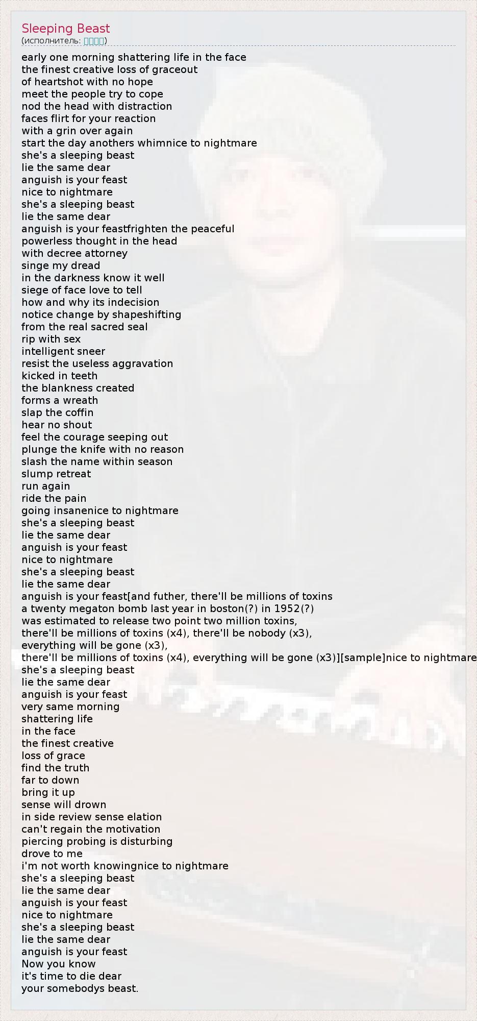 early one morning shattering life in the face the finest creative loss of graceout of heartshot with no hope meet the people try to cope nod the head with distraction faces flirt for your reaction with a grin over again start the day anothers whimnice to nightmare she's a sleeping beast lie the same dear anguish is your feast nice to nightmare she's a sleeping beast lie the same dear anguish is your feastfrighten the peaceful powerless thought in the head with decree attorney singe my dread in the darkness know it well siege of face love to tell how and why its indecision notice change by shapeshifting from the real sacred seal rip with sex intelligent sneer resist the useless aggravation kicked in teeth the blankness created forms a wreath slap the coffin hear no shout feel the courage seeping out plunge the knife with no reason slash the name within season slump retreat run again ride the pain going insanenice to nightmare she's a sleeping beast lie the same dear anguish is your feast nice to nightmare she's a sleeping beast lie the same dear anguish is your feast[and futher, there'll be millions of toxins a twenty megaton bomb last year in boston(?) in 1952(?) was estimated to release two point two million toxins, there'll be millions of toxins (x4), there'll be nobody (x3), everything will be gone (x3), there'll be millions of toxins (x4), everything will be gone (x3)][sample]nice to nightmare she's a sleeping beast lie the same dear anguish is your feast very same morning shattering life in the face the finest creative loss of grace find the truth far to down bring it up sense will drown in side review sense elation can't regain the motivation piercing probing is disturbing drove to me i'm not worth knowingnice to nightmare she's a sleeping beast lie the same dear anguish is your feast nice to nightmare she's a sleeping beast lie the same dear anguish is your feast Now you know it's time to die dear your somebodys beast.
