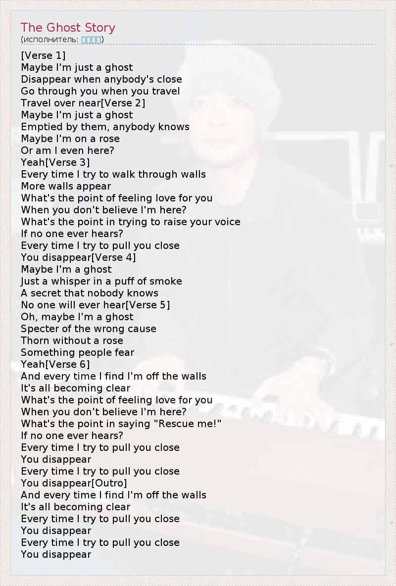 [Verse 1] Maybe I'm just a ghost Disappear when anybody's close Go through you when you travel Travel over near[Verse 2] Maybe I'm just a ghost Emptied by them, anybody knows Maybe I'm on a rose Or am I even here? Yeah[Verse 3] Every time I try to walk through walls More walls appear What's the point of feeling love for you When you don't believe I'm here? What's the point in trying to raise your voice If no one ever hears? Every time I try to pull you close You disappear[Verse 4] Maybe I'm a ghost Just a whisper in a puff of smoke A secret that nobody knows No one will ever hear[Verse 5] Oh, maybe I'm a ghost Specter of the wrong cause Thorn without a rose Something people fear Yeah[Verse 6] And every time I find I'm off the walls It's all becoming clear What's the point of feeling love for you When you don't believe I'm here? What's the point in saying "Rescue me!" If no one ever hears? Every time I try to pull you close You disappear Every time I try to pull you close You disappear[Outro] And every time I find I'm off the walls It's all becoming clear Every time I try to pull you close You disappear Every time I try to pull you close You disappear