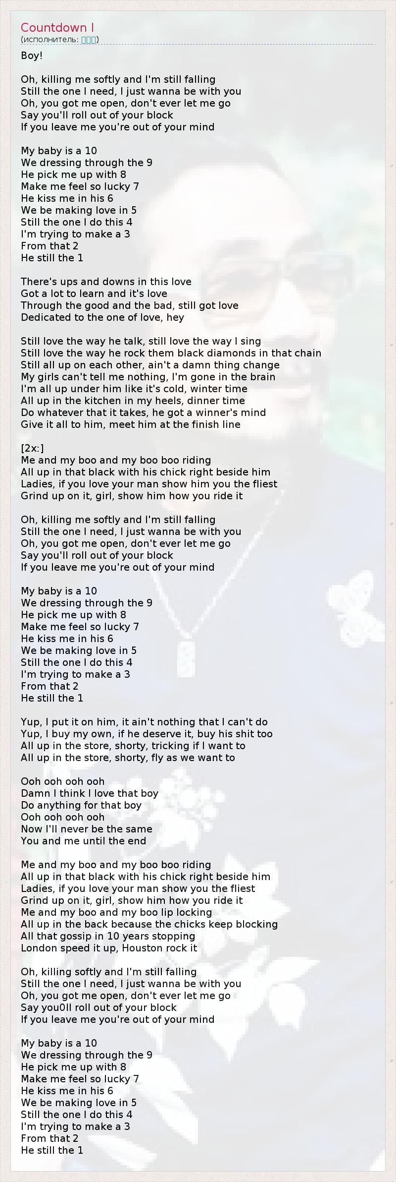 Boy! Oh, killing me softly and I'm still falling Still the one I need, I just wanna be with you Oh, you got me open, don't ever let me go Say you'll roll out of your block If you leave me you're out of your mind My baby is a 10 We dressing through the 9 He pick me up with 8 Make me feel so lucky 7 He kiss me in his 6 We be making love in 5 Still the one I do this 4 I'm trying to make a 3 From that 2 He still the 1 There's ups and downs in this love Got a lot to learn and it's love Through the good and the bad, still got love Dedicated to the one of love, hey Still love the way he talk, still love the way I sing Still love the way he rock them black diamonds in that chain Still all up on each other, ain't a damn thing change My girls can't tell me nothing, I'm gone in the brain I'm all up under him like it's cold, winter time All up in the kitchen in my heels, dinner time Do whatever that it takes, he got a winner's mind Give it all to him, meet him at the finish line [2x:] Me and my boo and my boo boo riding All up in that black with his chick right beside him Ladies, if you love your man show him you the fliest Grind up on it, girl, show him how you ride it Oh, killing me softly and I'm still falling Still the one I need, I just wanna be with you Oh, you got me open, don't ever let me go Say you'll roll out of your block If you leave me you're out of your mind My baby is a 10 We dressing through the 9 He pick me up with 8 Make me feel so lucky 7 He kiss me in his 6 We be making love in 5 Still the one I do this 4 I'm trying to make a 3 From that 2 He still the 1 Yup, I put it on him, it ain't nothing that I can't do Yup, I buy my own, if he deserve it, buy his shit too All up in the store, shorty, tricking if I want to All up in the store, shorty, fly as we want to Ooh ooh ooh ooh Damn I think I love that boy Do anything for that boy Ooh ooh ooh ooh Now I'll never be the same You and me until the end Me and my boo and my boo boo riding All up in that black with his chick right beside him Ladies, if you love your man show you the fliest Grind up on it, girl, show him how you ride it Me and my boo and my boo lip locking All up in the back because the chicks keep blocking All that gossip in 10 years stopping London speed it up, Houston rock it Oh, killing softly and I'm still falling Still the one I need, I just wanna be with you Oh, you got me open, don't ever let me go Say you0ll roll out of your block If you leave me you're out of your mind My baby is a 10 We dressing through the 9 He pick me up with 8 Make me feel so lucky 7 He kiss me in his 6 We be making love in 5 Still the one I do this 4 I'm trying to make a 3 From that 2 He still the 1