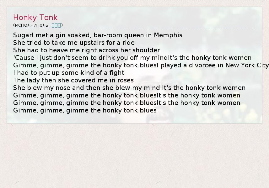 А как ты думаешь, о чем песня "Honky Tonk" ?