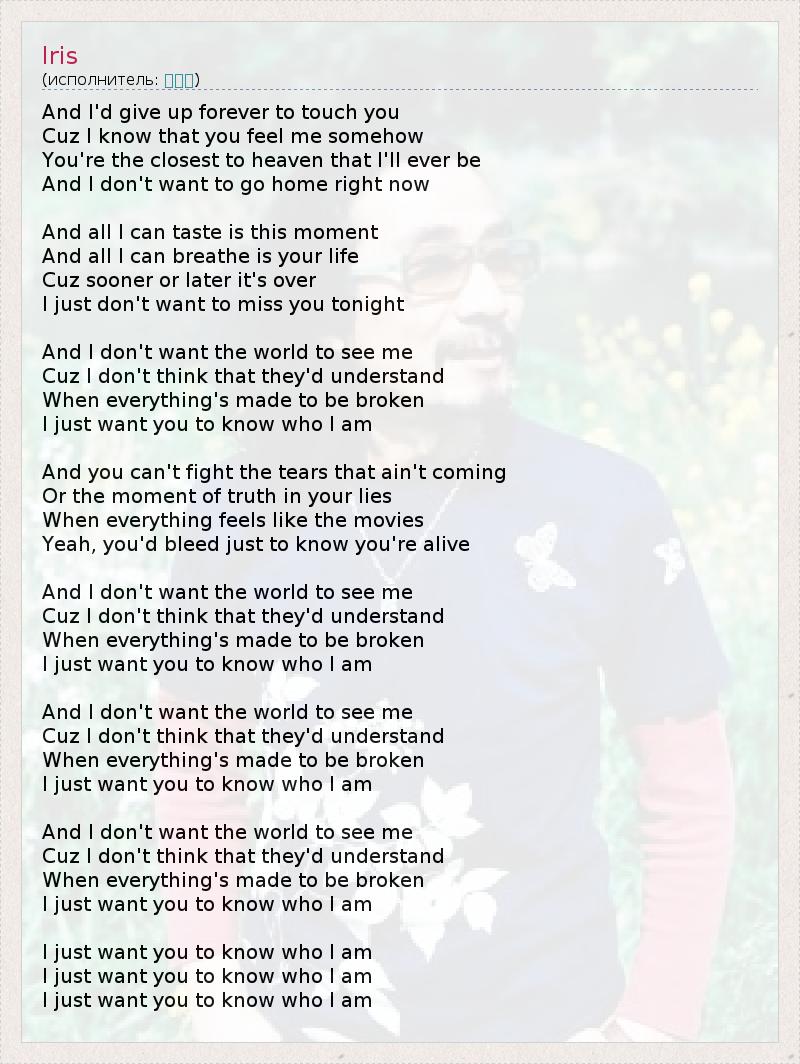 And I'd give up forever to touch you Cuz I know that you feel me somehow You're the closest to heaven that I'll ever be And I don't want to go home right now And all I can taste is this moment And all I can breathe is your life Cuz sooner or later it's over I just don't want to miss you tonight And I don't want the world to see me Cuz I don't think that they'd understand When everything's made to be broken I just want you to know who I am And you can't fight the tears that ain't coming Or the moment of truth in your lies When everything feels like the movies Yeah, you'd bleed just to know you're alive And I don't want the world to see me Cuz I don't think that they'd understand When everything's made to be broken I just want you to know who I am And I don't want the world to see me Cuz I don't think that they'd understand When everything's made to be broken I just want you to know who I am And I don't want the world to see me Cuz I don't think that they'd understand When everything's made to be broken I just want you to know who I am I just want you to know who I am I just want you to know who I am I just want you to know who I am