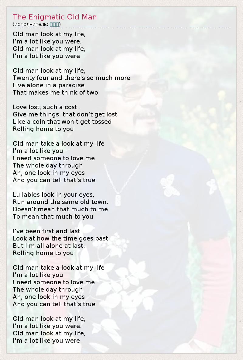 Старик, взгляни на мою жизнь, Во многом я такой же, каким был ты, Старик, взгляни на мою жизнь, Во многом я такой же, каким был ты Старик, взгляни на мою жизнь, Мне 24, и столько всего еще впереди, А я живу один в раю, что заставляет Меня думать о том, каково быть вдвоем Потерянная любовь, такая вот цена.. Дай же мне что-то, что нельзя потерять, Словно монетку, которую как бы ни подкинули, А она катится назад к тебе Старик, взгляни на мою жизнь, Во многом я такой же, как и ты, Мне нужен кто-то, кто любил бы меня На протяжении всего дня, Ах, лишь взгляни в мои глаза И ты поймешь, что это правда В твоих глазах убаюкивающие песни, Все тот же старый городок, И мне не особо и важно, Значу ли я что-нибудь для тебя Я был и первым, и последним, Взгляни, как проходит время, В конце концов я остался совсем один, Я возвращаюсь домой, к тебе Старик, взгляни на мою жизнь, Во многом я такой же, как и ты, Мне нужен кто-то, кто любил бы меня На протяжении всего дня, Ах, лишь взгляни в мои глаза И ты поймешь, что это правда Старик, взгляни на мою жизнь, Во многом я такой же, каким был ты, Старик, взгляни на мою жизнь, Во многом я такой же, каким был ты