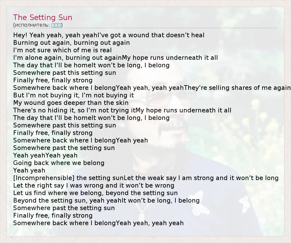 Hey! Yeah yeah, yeah yeahI've got a wound that doesn't heal Burning out again, burning out again I'm not sure which of me is real I'm alone again, burning out againMy hope runs underneath it all The day that I'll be homeIt won't be long, I belong Somewhere past this setting sun Finally free, finally strong Somewhere back where I belongYeah yeah, yeah yeahThey're selling shares of me again But I'm not buying it, I'm not buying it My wound goes deeper than the skin There's no hiding it, so I'm not trying itMy hope runs underneath it all The day that I'll be homeIt won't be long, I belong Somewhere past this setting sun Finally free, finally strong Somewhere back where I belongYeah yeah Somewhere past the setting sun Yeah yeahYeah yeah Going back where we belong Yeah yeah [Incomprehensible] the setting sunLet the weak say I am strong and it won't be long Let the right say I was wrong and it won't be wrong Let us find where we belong, beyond the setting sun Beyond the setting sun, yeah yeahIt won't be long, I belong Somewhere past the setting sun Finally free, finally strong Somewhere back where I belongYeah yeah, yeah yeah