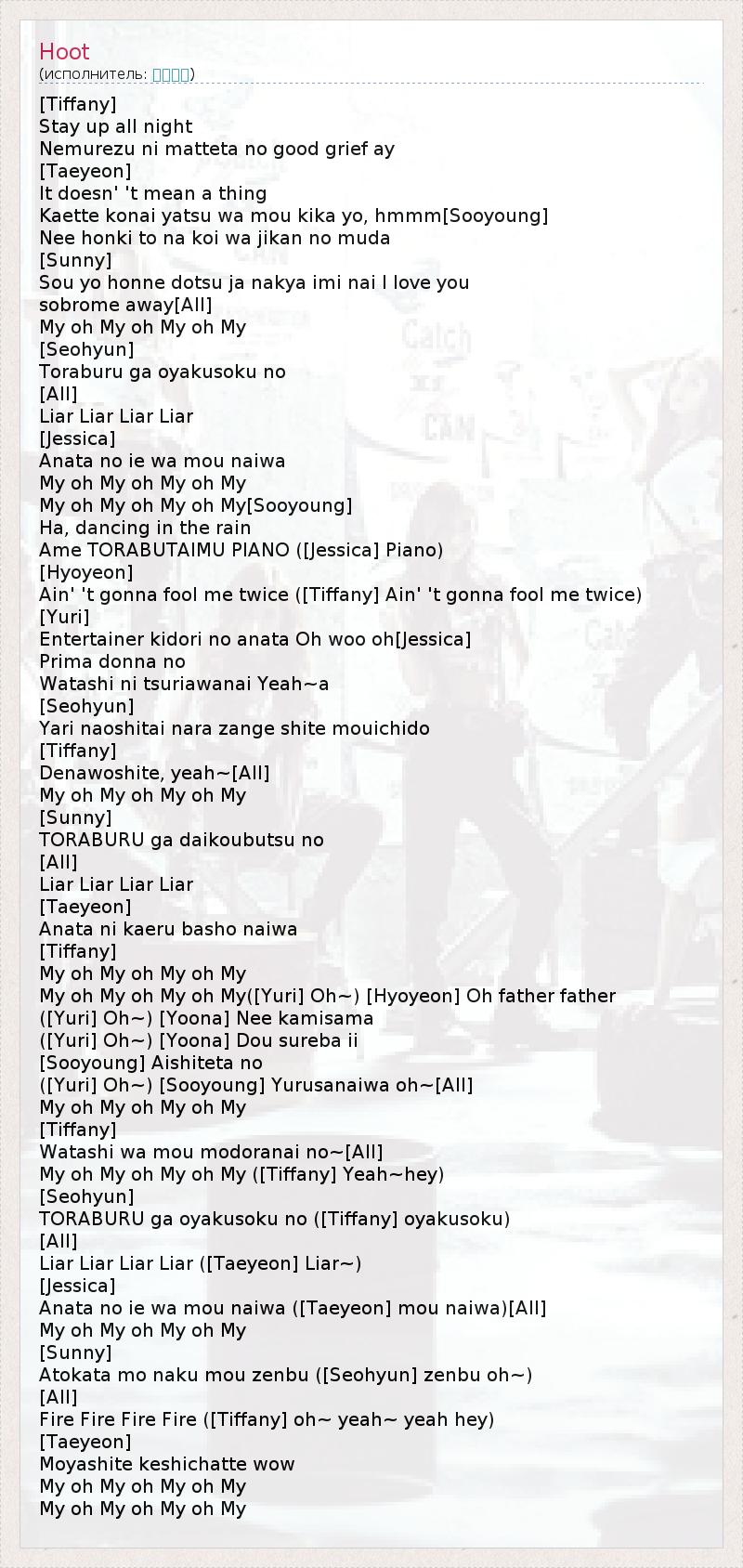 [Tiffany] Stay up all night Nemurezu ni matteta no good grief ay [Taeyeon] It doesn' 't mean a thing Kaette konai yatsu wa mou kika yo, hmmm[Sooyoung] Nee honki to na koi wa jikan no muda [Sunny] Sou yo honne dotsu ja nakya imi nai I love you sobrome away[All] My oh My oh My oh My [Seohyun] Toraburu ga oyakusoku no [All] Liar Liar Liar Liar [Jessica] Anata no ie wa mou naiwa My oh My oh My oh My My oh My oh My oh My[Sooyoung] Ha, dancing in the rain Ame TORABUTAIMU PIANO ([Jessica] Piano) [Hyoyeon] Ain' 't gonna fool me twice ([Tiffany] Ain' 't gonna fool me twice) [Yuri] Entertainer kidori no anata Oh woo oh[Jessica] Prima donna no Watashi ni tsuriawanai Yeah~a [Seohyun] Yari naoshitai nara zange shite mouichido [Tiffany] Denawoshite, yeah~[All] My oh My oh My oh My [Sunny] TORABURU ga daikoubutsu no [All] Liar Liar Liar Liar [Taeyeon] Anata ni kaeru basho naiwa [Tiffany] My oh My oh My oh My My oh My oh My oh My([Yuri] Oh~) [Hyoyeon] Oh father father ([Yuri] Oh~) [Yoona] Nee kamisama ([Yuri] Oh~) [Yoona] Dou sureba ii [Sooyoung] Aishiteta no ([Yuri] Oh~) [Sooyoung] Yurusanaiwa oh~[All] My oh My oh My oh My [Tiffany] Watashi wa mou modoranai no~[All] My oh My oh My oh My ([Tiffany] Yeah~hey) [Seohyun] TORABURU ga oyakusoku no ([Tiffany] oyakusoku) [All] Liar Liar Liar Liar ([Taeyeon] Liar~) [Jessica] Anata no ie wa mou naiwa ([Taeyeon] mou naiwa)[All] My oh My oh My oh My [Sunny] Atokata mo naku mou zenbu ([Seohyun] zenbu oh~) [All] Fire Fire Fire Fire ([Tiffany] oh~ yeah~ yeah hey) [Taeyeon] Moyashite keshichatte wow My oh My oh My oh My My oh My oh My oh My