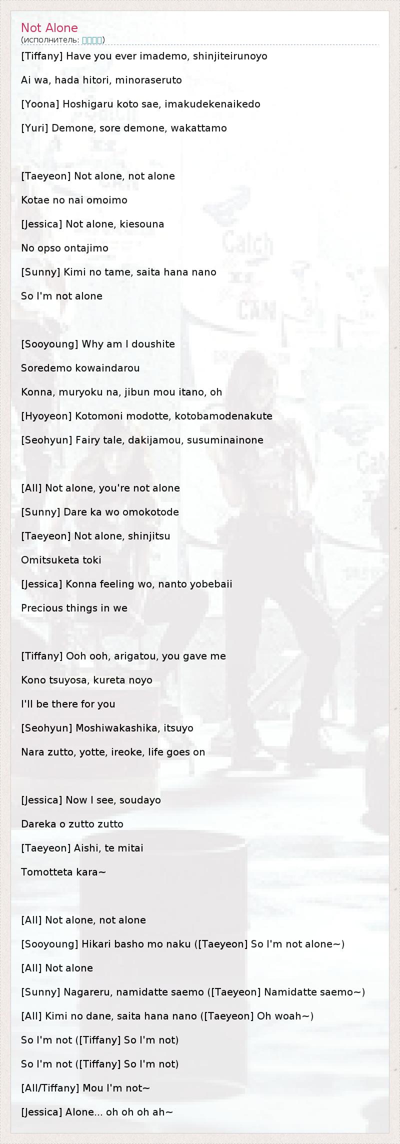 [Tiffany] Have you ever imademo, shinjiteirunoyo Ai wa, hada hitori, minoraseruto [Yoona] Hoshigaru koto sae, imakudekenaikedo [Yuri] Demone, sore demone, wakattamo [Taeyeon] Not alone, not alone Kotae no nai omoimo [Jessica] Not alone, kiesouna No opso ontajimo [Sunny] Kimi no tame, saita hana nano So I'm not alone [Sooyoung] Why am I doushite Soredemo kowaindarou Konna, muryoku na, jibun mou itano, oh [Hyoyeon] Kotomoni modotte, kotobamodenakute [Seohyun] Fairy tale, dakijamou, susuminainone [All] Not alone, you're not alone [Sunny] Dare ka wo omokotode [Taeyeon] Not alone, shinjitsu Omitsuketa toki [Jessica] Konna feeling wo, nanto yobebaii Precious things in we [Tiffany] Ooh ooh, arigatou, you gave me Kono tsuyosa, kureta noyo I'll be there for you [Seohyun] Moshiwakashika, itsuyo Nara zutto, yotte, ireoke, life goes on [Jessica] Now I see, soudayo Dareka o zutto zutto [Taeyeon] Aishi, te mitai Tomotteta kara~ [All] Not alone, not alone [Sooyoung] Hikari basho mo naku ([Taeyeon] So I'm not alone~) [All] Not alone [Sunny] Nagareru, namidatte saemo ([Taeyeon] Namidatte saemo~) [All] Kimi no dane, saita hana nano ([Taeyeon] Oh woah~) So I'm not ([Tiffany] So I'm not) So I'm not ([Tiffany] So I'm not) [All/Tiffany] Mou I'm not~ [Jessica] Alone... oh oh oh ah~