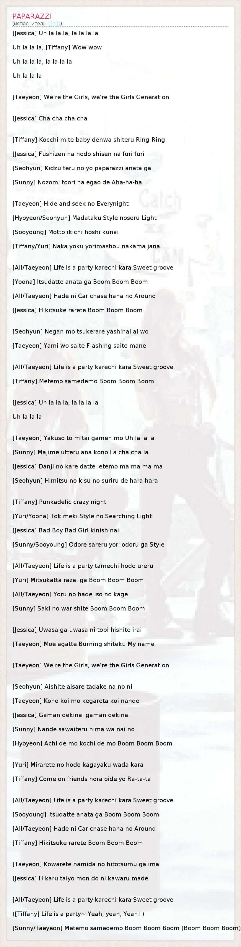 [Jessica] Uh la la la, la la la la Uh la la la, [Tiffany] Wow wow Uh la la la, la la la la Uh la la la [Taeyeon] We're the Girls, we're the Girls Generation [Jessica] Cha cha cha cha [Tiffany] Kocchi mite baby denwa shiteru Ring-Ring [Jessica] Fushizen na hodo shisen na furi furi [Seohyun] Kidzuiteru no yo paparazzi anata ga [Sunny] Nozomi toori na egao de Aha-ha-ha [Taeyeon] Hide and seek no Everynight [Hyoyeon/Seohyun] Madataku Style noseru Light [Sooyoung] Motto ikichi hoshi kunai [Tiffany/Yuri] Naka yoku yorimashou nakama janai [All/Taeyeon] Life is a party karechi kara Sweet groove [Yoona] Itsudatte anata ga Boom Boom Boom [All/Taeyeon] Hade ni Car chase hana no Around [Jessica] Hikitsuke rarete Boom Boom Boom [Seohyun] Negan mo tsukerare yashinai ai wo [Taeyeon] Yami wo saite Flashing saite mane [All/Taeyeon] Life is a party karechi kara Sweet groove [Tiffany] Metemo samedemo Boom Boom Boom [Jessica] Uh la la la, la la la la Uh la la la [Taeyeon] Yakuso to mitai gamen mo Uh la la la [Sunny] Majime utteru ana kono La cha cha la [Jessica] Danji no kare datte ietemo ma ma ma ma [Seohyun] Himitsu no kisu no suriru de hara hara [Tiffany] Punkadelic crazy night [Yuri/Yoona] Tokimeki Style no Searching Light [Jessica] Bad Boy Bad Girl kinishinai [Sunny/Sooyoung] Odore sareru yori odoru ga Style [All/Taeyeon] Life is a party tamechi hodo ureru [Yuri] Mitsukatta razai ga Boom Boom Boom [All/Taeyeon] Yoru no hade iso no kage [Sunny] Saki no warishite Boom Boom Boom [Jessica] Uwasa ga uwasa ni tobi hishite irai [Taeyeon] Moe agatte Burning shiteku My name [Taeyeon] We're the Girls, we're the Girls Generation [Seohyun] Aishite aisare tadake na no ni [Taeyeon] Kono koi mo kegareta koi nande [Jessica] Gaman dekinai gaman dekinai [Sunny] Nande sawaiteru hima wa nai no [Hyoyeon] Achi de mo kochi de mo Boom Boom Boom [Yuri] Mirarete no hodo kagayaku wada kara [Tiffany] Come on friends hora oide yo Ra-ta-ta [All/Taeyeon] Life is a party karechi kara Sweet groove [Sooyoung] Itsudatte anata ga Boom Boom Boom [All/Taeyeon] Hade ni Car chase hana no Around [Tiffany] Hikitsuke rarete Boom Boom Boom [Taeyeon] Kowarete namida no hitotsumu ga ima [Jessica] Hikaru taiyo mon do ni kawaru made [All/Taeyeon] Life is a party karechi kara Sweet groove ([Tiffany] Life is a party~ Yeah, yeah, Yeah! ) [Sunny/Taeyeon] Metemo samedemo Boom Boom Boom (Boom Boom Boom)