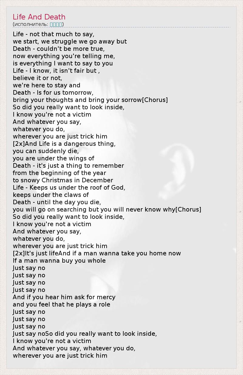 Life - not that much to say, we start, we struggle we go away but Death - couldn't be more true, now everything you're telling me, is everything I want to say to you Life - I know, it isn't fair but , believe it or not, we're here to stay and Death - Is for us tomorrow, bring your thoughts and bring your sorrow[Chorus] So did you really want to look inside, I know you're not a victim And whatever you say, whatever you do, wherever you are just trick him [2x]And Life is a dangerous thing, you can suddenly die, you are under the wings of Death - it's just a thing to remember from the beginning of the year to snowy Christmas in December Life - Keeps us under the roof of God, keeps under the claws of Death - until the day you die, you will go on searching but you will never know why[Chorus] So did you really want to look inside, I know you're not a victim And whatever you say, whatever you do, wherever you are just trick him [2x]It's just lifeAnd if a man wanna take you home now If a man wanna buy you whole Just say no Just say no Just say no Just say no And if you hear him ask for mercy and you feel that he plays a role Just say no Just say no Just say no Just say noSo did you really want to look inside, I know you're not a victim And whatever you say, whatever you do, wherever you are just trick him