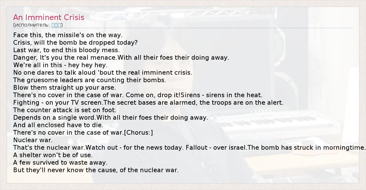 А как ты думаешь, о чем песня "An Imminent Crisis" ?