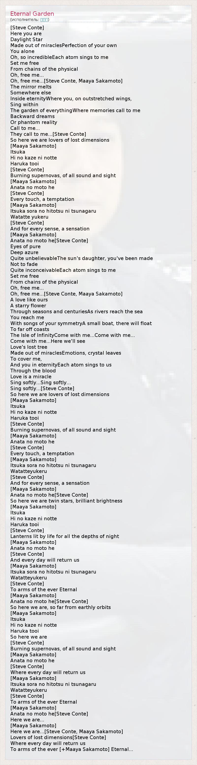 [Steve Conte] Here you are Daylight Star Made out of miraclesPerfection of your own You alone Oh, so incredibleEach atom sings to me Set me free From chains of the physical Oh, free me... Oh, free me...[Steve Conte, Maaya Sakamoto] The mirror melts Somewhere else Inside eternityWhere you, on outstretched wings, Sing within The garden of everythingWhere memories call to me Backward dreams Or phantom reality Call to me... They call to me...[Steve Conte] So here we are lovers of lost dimensions [Maaya Sakamoto] Itsuka Hi no kaze ni notte Haruka tooi [Steve Conte] Burning supernovas, of all sound and sight [Maaya Sakamoto] Anata no moto he [Steve Conte] Every touch, a temptation [Maaya Sakamoto] Itsuka sora no hitotsu ni tsunagaru Watatte yukeru [Steve Conte] And for every sense, a sensation [Maaya Sakamoto] Anata no moto he[Steve Conte] Eyes of pure Deep azure Quite unbelievableThe sun's daughter, you've been made Not to fade Quite inconceivableEach atom sings to me Set me free From chains of the physical Oh, free me... Oh, free me...[Steve Conte, Maaya Sakamoto] A love like ours A starry flower Through seasons and centuriesAs rivers reach the sea You reach me With songs of your symmetryA small boat, there will float To far off coasts The Isle of InfinityCome with me...Come with me... Come with me...Here we'll see Love's lost tree Made out of miraclesEmotions, crystal leaves To cover me, And you in eternityEach atom sings to us Through the blood Love is a miracle Sing softly...Sing softly... Sing softly...[Steve Conte] So here we are lovers of lost dimensions [Maaya Sakamoto] Itsuka Hi no kaze ni notte Haruka tooi [Steve Conte] Burning supernovas, of all sound and sight [Maaya Sakamoto] Anata no moto he [Steve Conte] Every touch, a temptation [Maaya Sakamoto] Itsuka sora no hitotsu ni tsunagaru Watatteyukeru [Steve Conte] And for every sense, a sensation [Maaya Sakamoto] Anata no moto he[Steve Conte] So here we are twin stars, brilliant brightness [Maaya Sakamoto] Itsuka Hi no kaze ni notte Haruka tooi [Steve Conte] Lanterns lit by life for all the depths of night [Maaya Sakamoto] Anata no moto he [Steve Conte] And every day will return us [Maaya Sakamoto] Itsuka sora no hitotsu ni tsunagaru Watatteyukeru [Steve Conte] To arms of the ever Eternal [Maaya Sakamoto] Anata no moto he[Steve Conte] So here we are, so far from earthly orbits [Maaya Sakamoto] Itsuka Hi no kaze ni notte Haruka tooi So here we are [Steve Conte] Burning supernovas, of all sound and sight [Maaya Sakamoto] Anata no moto he [Steve Conte] Where every day will return us [Maaya Sakamoto] Itsuka sora no hitotsu ni tsunagaru Watatteyukeru [Steve Conte] To arms of the ever Eternal [Maaya Sakamoto] Anata no moto he[Steve Conte] Here we are... [Maaya Sakamoto] Here we are...[Steve Conte, Maaya Sakamoto] Lovers of lost dimensions[Steve Conte] Where every day will return us To arms of the ever [+Maaya Sakamoto] Eternal...