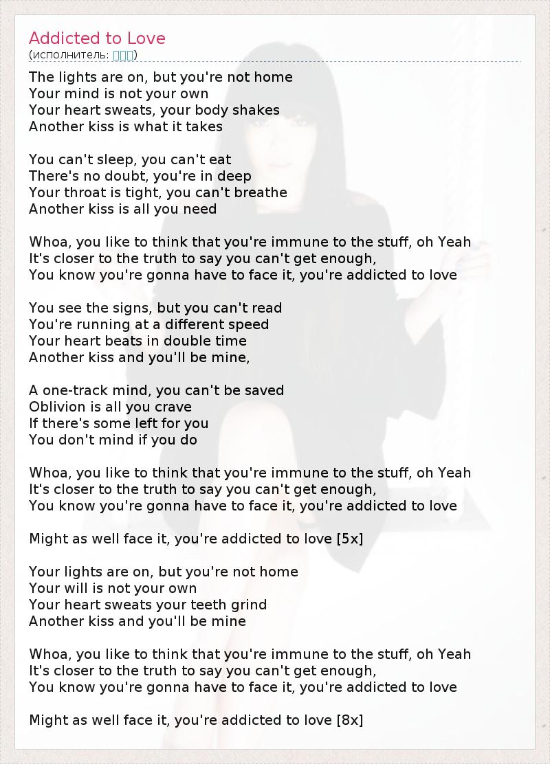 The lights are on, but you're not home Your mind is not your own Your heart sweats, your body shakes Another kiss is what it takes You can't sleep, you can't eat There's no doubt, you're in deep Your throat is tight, you can't breathe Another kiss is all you need Whoa, you like to think that you're immune to the stuff, oh Yeah It's closer to the truth to say you can't get enough, You know you're gonna have to face it, you're addicted to love You see the signs, but you can't read You're running at a different speed Your heart beats in double time Another kiss and you'll be mine, A one-track mind, you can't be saved Oblivion is all you crave If there's some left for you You don't mind if you do Whoa, you like to think that you're immune to the stuff, oh Yeah It's closer to the truth to say you can't get enough, You know you're gonna have to face it, you're addicted to love Might as well face it, you're addicted to love [5x] Your lights are on, but you're not home Your will is not your own Your heart sweats your teeth grind Another kiss and you'll be mine Whoa, you like to think that you're immune to the stuff, oh Yeah It's closer to the truth to say you can't get enough, You know you're gonna have to face it, you're addicted to love Might as well face it, you're addicted to love [8x]