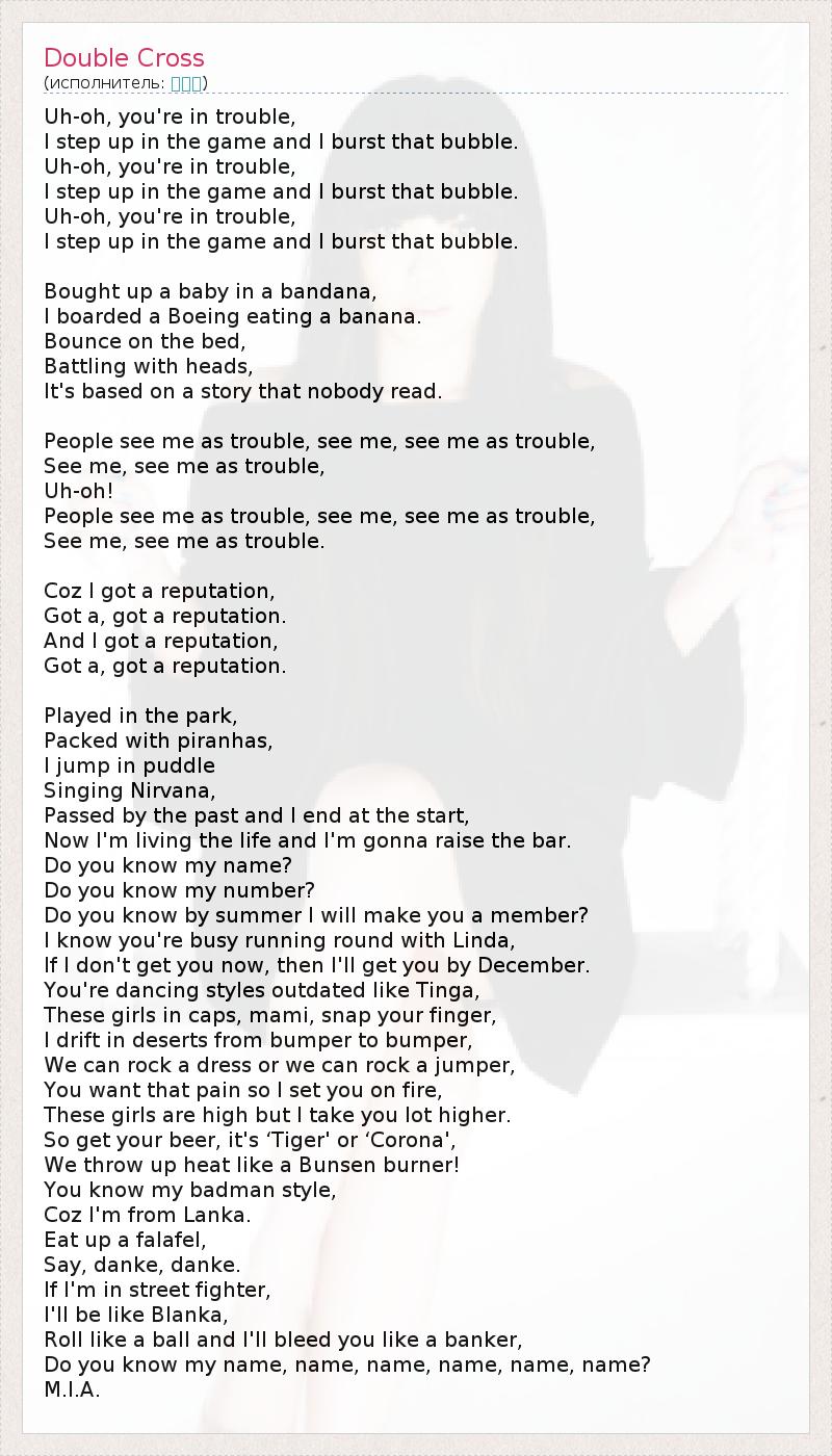 Uh-oh, you're in trouble, I step up in the game and I burst that bubble. Uh-oh, you're in trouble, I step up in the game and I burst that bubble. Uh-oh, you're in trouble, I step up in the game and I burst that bubble. Bought up a baby in a bandana, I boarded a Boeing eating a banana. Bounce on the bed, Battling with heads, It's based on a story that nobody read. People see me as trouble, see me, see me as trouble, See me, see me as trouble, Uh-oh! People see me as trouble, see me, see me as trouble, See me, see me as trouble. Coz I got a reputation, Got a, got a reputation. And I got a reputation, Got a, got a reputation. Played in the park, Packed with piranhas, I jump in puddle Singing Nirvana, Passed by the past and I end at the start, Now I'm living the life and I'm gonna raise the bar. Do you know my name? Do you know my number? Do you know by summer I will make you a member? I know you're busy running round with Linda, If I don't get you now, then I'll get you by December. You're dancing styles outdated like Tinga, These girls in caps, mami, snap your finger, I drift in deserts from bumper to bumper, We can rock a dress or we can rock a jumper, You want that pain so I set you on fire, These girls are high but I take you lot higher. So get your beer, it's ‘Tiger' or ‘Corona', We throw up heat like a Bunsen burner! You know my badman style, Coz I'm from Lanka. Eat up a falafel, Say, danke, danke. If I'm in street fighter, I'll be like Blanka, Roll like a ball and I'll bleed you like a banker, Do you know my name, name, name, name, name, name? M.I.A.