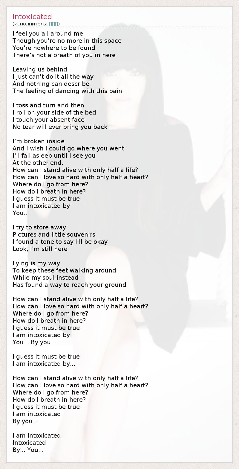 Я чувствую, что ты рядом, Хотя тебя здесь больше нет. Тебя нигде нельзя найти, Здесь даже твоим духом не пахнет*... Оставляя "нас" позади, Я просто не могу cделать раз и навсегда. Ничто не может описать Чувство танца с этой болью... Я рву и мечу, а потом Скатываюсь на твою сторону кровати. Я касаюсь твоего несуществующего лица, Мои слезы не вернут тебя... Я сломана изнутри, Я хотела бы уйти туда, куда ушел ты. Я буду спать, пока не увижу тебя На той стороне... Как я могу жить с одной лишь половиной жизни? Как я могу страстно любить с одной лишь половиной сердца? Куда мне идти отсюда? Как мне дышать здесь? Должно быть, это правда, Я опьянена Тобой... Я пытаюсь сохранить Фотографии и маленькие сувениры, Я выбрала подходящий тон, чтобы сказать, что буду в порядке. Смотри, я все еще здесь... Ложь - мой путь Заставлять эти ноги передвигаться, Пока моя душа Ищет путь к твоей земле... Как я могу жить с одной лишь половиной жизни? Как я могу страстно любить с одной лишь половиной сердца? Куда мне идти отсюда? Как мне дышать здесь? Должно быть, это правда, Я опьянена Тобой... Должно быть, это правда, Я опьянена... Как я могу жить с одной лишь половиной жизни? Как я могу страстно любить с одной лишь половиной сердца? Куда мне идти отсюда? Как мне дышать здесь? Должно быть, это правда, Я опьянена Тобой... Я опьянена... Опьянена... Тобой... * - досл.: здесь нет твоего дыхания