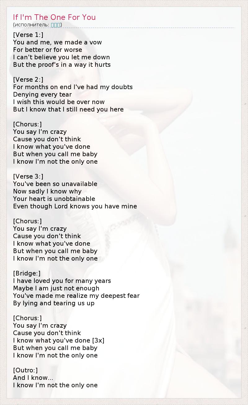 [Verse 1:] You and me, we made a vow For better or for worse I can't believe you let me down But the proof's in a way it hurts [Verse 2:] For months on end I've had my doubts Denying every tear I wish this would be over now But I know that I still need you here [Chorus:] You say I'm crazy Cause you don't think I know what you've done But when you call me baby I know I'm not the only one [Verse 3:] You've been so unavailable Now sadly I know why Your heart is unobtainable Even though Lord knows you have mine [Chorus:] You say I'm crazy Cause you don't think I know what you've done But when you call me baby I know I'm not the only one [Bridge:] I have loved you for many years Maybe I am just not enough You've made me realize my deepest fear By lying and tearing us up [Chorus:] You say I'm crazy Cause you don't think I know what you've done [3x] But when you call me baby I know I'm not the only one [Outro:] And I know... I know I'm not the only one