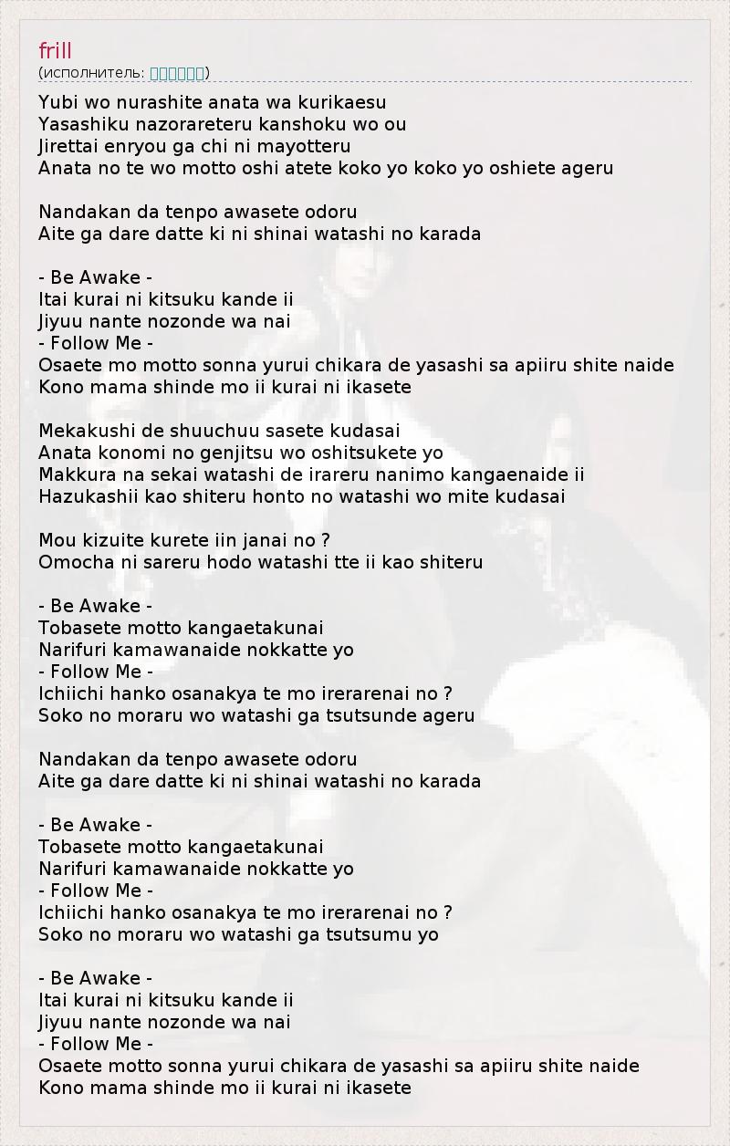 Yubi wo nurashite anata wa kurikaesu Yasashiku nazorareteru kanshoku wo ou Jirettai enryou ga chi ni mayotteru Anata no te wo motto oshi atete koko yo koko yo oshiete ageru Nandakan da tenpo awasete odoru Aite ga dare datte ki ni shinai watashi no karada - Be Awake - Itai kurai ni kitsuku kande ii Jiyuu nante nozonde wa nai - Follow Me - Osaete mo motto sonna yurui chikara de yasashi sa apiiru shite naide Kono mama shinde mo ii kurai ni ikasete Mekakushi de shuuchuu sasete kudasai Anata konomi no genjitsu wo oshitsukete yo Makkura na sekai watashi de irareru nanimo kangaenaide ii Hazukashii kao shiteru honto no watashi wo mite kudasai Mou kizuite kurete iin janai no ? Omocha ni sareru hodo watashi tte ii kao shiteru - Be Awake - Tobasete motto kangaetakunai Narifuri kamawanaide nokkatte yo - Follow Me - Ichiichi hanko osanakya te mo irerarenai no ? Soko no moraru wo watashi ga tsutsunde ageru Nandakan da tenpo awasete odoru Aite ga dare datte ki ni shinai watashi no karada - Be Awake - Tobasete motto kangaetakunai Narifuri kamawanaide nokkatte yo - Follow Me - Ichiichi hanko osanakya te mo irerarenai no ? Soko no moraru wo watashi ga tsutsumu yo - Be Awake - Itai kurai ni kitsuku kande ii Jiyuu nante nozonde wa nai - Follow Me - Osaete motto sonna yurui chikara de yasashi sa apiiru shite naide Kono mama shinde mo ii kurai ni ikasete