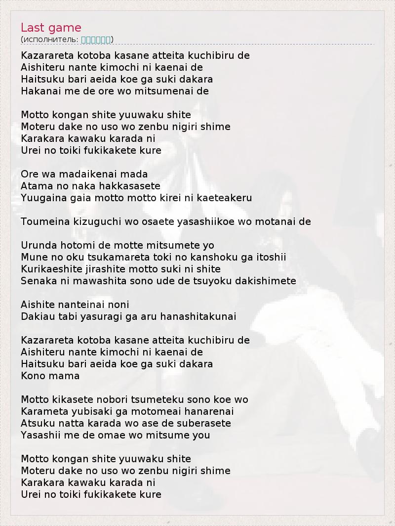 Kazarareta kotoba kasane atteita kuchibiru de Aishiteru nante kimochi ni kaenai de Haitsuku bari aeida koe ga suki dakara Hakanai me de ore wo mitsumenai de Motto kongan shite yuuwaku shite Moteru dake no uso wo zenbu nigiri shime Karakara kawaku karada ni Urei no toiki fukikakete kure Ore wa madaikenai mada Atama no naka hakkasasete Yuugaina gaia motto motto kirei ni kaeteakeru Toumeina kizuguchi wo osaete yasashiikoe wo motanai de Urunda hotomi de motte mitsumete yo Mune no oku tsukamareta toki no kanshoku ga itoshii Kurikaeshite jirashite motto suki ni shite Senaka ni mawashita sono ude de tsuyoku dakishimete Aishite nanteinai noni Dakiau tabi yasuragi ga aru hanashitakunai Kazarareta kotoba kasane atteita kuchibiru de Aishiteru nante kimochi ni kaenai de Haitsuku bari aeida koe ga suki dakara Kono mama Motto kikasete nobori tsumeteku sono koe wo Karameta yubisaki ga motomeai hanarenai Atsuku natta karada wo ase de suberasete Yasashii me de omae wo mitsume you Motto kongan shite yuuwaku shite Moteru dake no uso wo zenbu nigiri shime Karakara kawaku karada ni Urei no toiki fukikakete kure