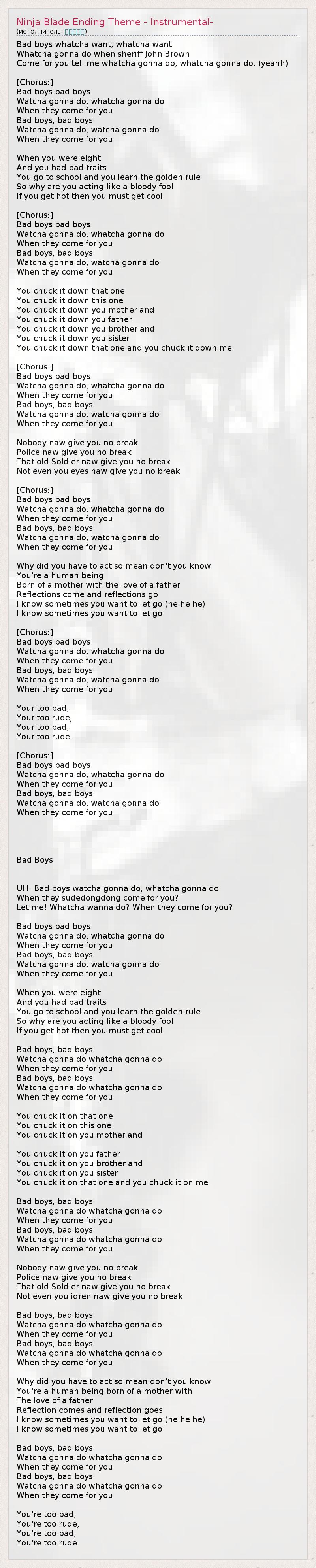 Bad boys whatcha want, whatcha want Whatcha gonna do when sheriff John Brown Come for you tell me whatcha gonna do, whatcha gonna do. (yeahh) [Chorus:] Bad boys bad boys Watcha gonna do, whatcha gonna do When they come for you Bad boys, bad boys Watcha gonna do, watcha gonna do When they come for you When you were eight And you had bad traits You go to school and you learn the golden rule So why are you acting like a bloody fool If you get hot then you must get cool [Chorus:] Bad boys bad boys Watcha gonna do, whatcha gonna do When they come for you Bad boys, bad boys Watcha gonna do, watcha gonna do When they come for you You chuck it down that one You chuck it down this one You chuck it down you mother and You chuck it down you father You chuck it down you brother and You chuck it down you sister You chuck it down that one and you chuck it down me [Chorus:] Bad boys bad boys Watcha gonna do, whatcha gonna do When they come for you Bad boys, bad boys Watcha gonna do, watcha gonna do When they come for you Nobody naw give you no break Police naw give you no break That old Soldier naw give you no break Not even you eyes naw give you no break [Chorus:] Bad boys bad boys Watcha gonna do, whatcha gonna do When they come for you Bad boys, bad boys Watcha gonna do, watcha gonna do When they come for you Why did you have to act so mean don't you know You're a human being Born of a mother with the love of a father Reflections come and reflections go I know sometimes you want to let go (he he he) I know sometimes you want to let go [Chorus:] Bad boys bad boys Watcha gonna do, whatcha gonna do When they come for you Bad boys, bad boys Watcha gonna do, watcha gonna do When they come for you Your too bad, Your too rude, Your too bad, Your too rude. [Chorus:] Bad boys bad boys Watcha gonna do, whatcha gonna do When they come for you Bad boys, bad boys Watcha gonna do, watcha gonna do When they come for you Bad Boys UH! Bad boys watcha gonna do, whatcha gonna do When they sudedongdong come for you? Let me! Whatcha wanna do? When they come for you? Bad boys bad boys Watcha gonna do, whatcha gonna do When they come for you Bad boys, bad boys Watcha gonna do, watcha gonna do When they come for you When you were eight And you had bad traits You go to school and you learn the golden rule So why are you acting like a bloody fool If you get hot then you must get cool Bad boys, bad boys Watcha gonna do whatcha gonna do When they come for you Bad boys, bad boys Watcha gonna do whatcha gonna do When they come for you You chuck it on that one You chuck it on this one You chuck it on you mother and You chuck it on you father You chuck it on you brother and You chuck it on you sister You chuck it on that one and you chuck it on me Bad boys, bad boys Watcha gonna do whatcha gonna do When they come for you Bad boys, bad boys Watcha gonna do whatcha gonna do When they come for you Nobody naw give you no break Police naw give you no break That old Soldier naw give you no break Not even you idren naw give you no break Bad boys, bad boys Watcha gonna do whatcha gonna do When they come for you Bad boys, bad boys Watcha gonna do whatcha gonna do When they come for you Why did you have to act so mean don't you know You're a human being born of a mother with The love of a father Reflection comes and reflection goes I know sometimes you want to let go (he he he) I know sometimes you want to let go Bad boys, bad boys Watcha gonna do whatcha gonna do When they come for you Bad boys, bad boys Watcha gonna do whatcha gonna do When they come for you You're too bad, You're too rude, You're too bad, You're too rude