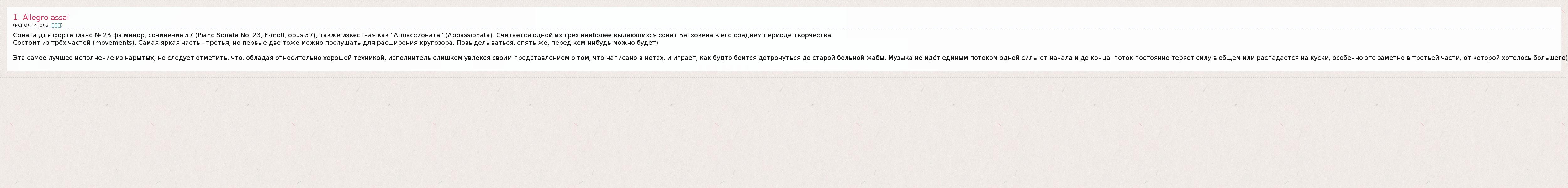 Эта самое лучшее исполнение из нарытых, но следует отметить, что, обладая относительно хорошей техникой, исполнитель слишком увлёкся своим представлением о том, что написано в нотах, и играет, как будто боится дотронуться до старой больной жабы. Музыка не идёт единым потоком одной силы от начала и до конца, поток постоянно теряет силу в общем или распадается на куски, особенно это заметно в третьей части, от которой хотелось большего)
