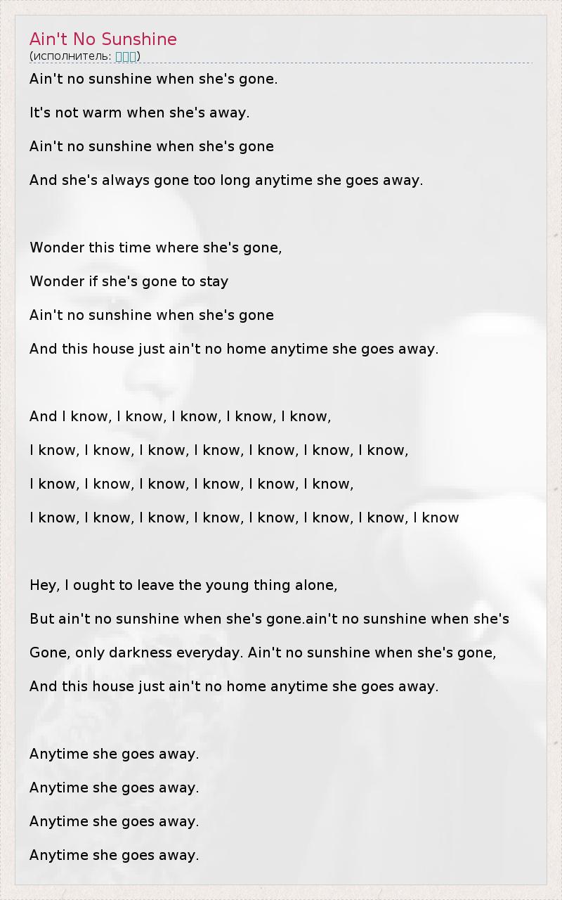 But ain't no sunshine when she's gone.ain't no sunshine when she's