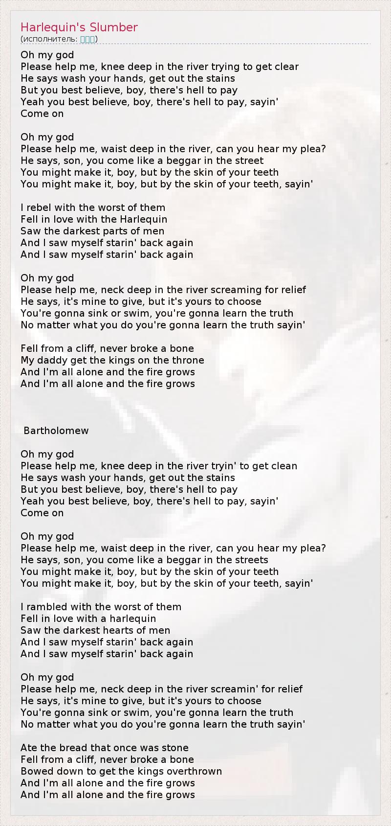 О, Господи, Пожалуйста, помоги мне, я стою по колено в реке, пытаясь отмыться, Он говорит: "Очисть руки, выведи пятна, Ведь тебе лучше верить, мальчик, что расплатой будет ад, Да, ведь тебе лучше верить, мальчик, что расплатой будет ад" Давай! О, Господи, Пожалуйста, помоги мне, я по пояс в реке, слышишь ли ты мой призыв? Он говорит: "Сынок, пойди, словно нищий по улице, И лучше сделай это, мальчик, впрочем, едва ли ты можешь 1 И лучше сделай это, мальчик, впрочем, едва ли ты можешь" Я мятежник, один из худших, Влюблённый в Арлекина, Я видел самые тёмные уголки души человека, И я видел себя, снова оглядываясь назад. И я видел себя, снова оглядываясь назад. О, Господи, Пожалуйста, помоги мне, я по шею в воде, молю о помощи Он говорит: "Даровать - мое право, но выбирать тебе. Ты утонешь или поплывешь, ты узнаешь правду, Неважно, что ты будешь делать, ты узнаешь правду." Упал со скалы, никогда не ломал кости, Мой папа возводил королей на престол, И я в полном одиночестве, и огонь разгорается, И я в полном одиночестве, огонь разгорается 1 - Дословно: при помощи кожи твоих зубов. Это цитата из библии означает "едва ли" в смысле возможности избежать катастрофы Варфоломей (перевод Константин из Ярославля) О, мой бог, Спаси меня, я по колено в воде, но правду смыть нельзя. Сказал он: "Руки омой, выведи следы. Поверь, тебе одна дорога - в ад" Да. Поверь, малыш, расплатой будет ад - сказал он. Вперёд. О, мой бог, Спаси меня, река уже по пояс мне. Услышь мои слова. Сказал он: "Словно нищий, руку протяни. Попробуй сделать так, но вряд ли в силах ты." Вперёд малыш,скорей протянешь ноги свои, не так ли?. Я когда-то среди них ходил. Влюблённым в арлекина был Каких только страстей я не узрел И обернувшись, сам себя я увидал И посмотрел на всё, с чего я начинал. О, мой бог, спаси меня, воды по шею, и я ищу благословления. Сказал он: "Помогу, но выбирать тебе. Ты пан или пропал, но плюсы есть везде" Что бы ни делал ты, я расскажу тебе правду. Я ел хлеб высеченный из камней. Я падал со скалы и не сломал костей. Я ставил на колени многих королей. А я совсем один и пламя всё растёт. И я совсем один, а пламя всё растёт.