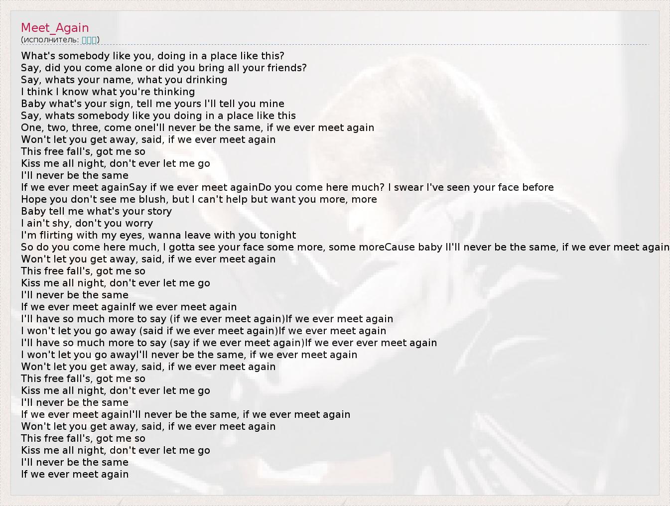 So do you come here much, I gotta see your face some more, some moreCause baby II'll never be the same, if we ever meet again