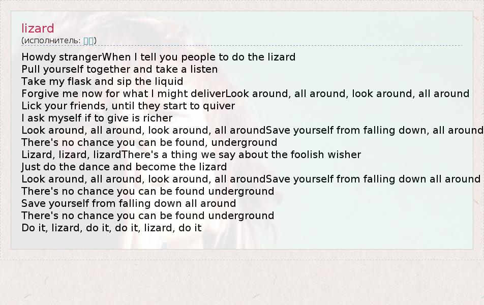Howdy strangerWhen I tell you people to do the lizard Pull yourself together and take a listen Take my flask and sip the liquid Forgive me now for what I might deliverLook around, all around, look around, all around Lick your friends, until they start to quiver I ask myself if to give is richer Look around, all around, look around, all aroundSave yourself from falling down, all around There's no chance you can be found, underground Lizard, lizard, lizardThere's a thing we say about the foolish wisher Just do the dance and become the lizard Look around, all around, look around, all aroundSave yourself from falling down all around There's no chance you can be found underground Save yourself from falling down all around There's no chance you can be found underground Do it, lizard, do it, do it, lizard, do it