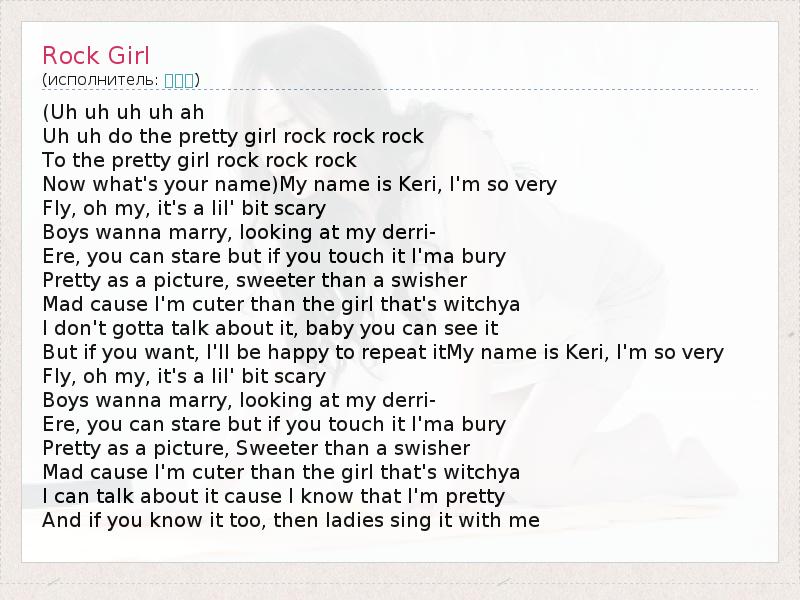 (Uh uh uh uh ah Uh uh do the pretty girl rock rock rock To the pretty girl rock rock rock Now what's your name)My name is Keri, I'm so very Fly, oh my, it's a lil' bit scary Boys wanna marry, looking at my derri- Ere, you can stare but if you touch it I'ma bury Pretty as a picture, sweeter than a swisher Mad cause I'm cuter than the girl that's witchya I don't gotta talk about it, baby you can see it But if you want, I'll be happy to repeat itMy name is Keri, I'm so very Fly, oh my, it's a lil' bit scary Boys wanna marry, looking at my derri- Ere, you can stare but if you touch it I'ma bury Pretty as a picture, Sweeter than a swisher Mad cause I'm cuter than the girl that's witchya I can talk about it cause I know that I'm pretty And if you know it too, then ladies sing it with me