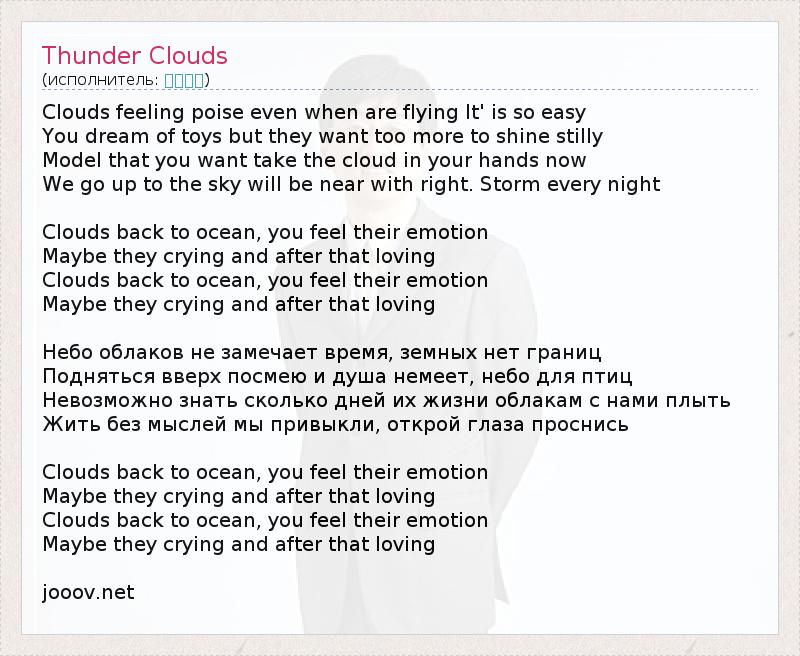 Clouds feeling poise even when are flying It' is so easy You dream of toys but they want too more to shine stilly Model that you want take the cloud in your hands now We go up to the sky will be near with right. Storm every night Clouds back to ocean, you feel their emotion Maybe they crying and after that loving Clouds back to ocean, you feel their emotion Maybe they crying and after that loving Небо облаков не замечает время, земных нет границ Подняться вверх посмею и душа немеет, небо для птиц Невозможно знать сколько дней их жизни облакам с нами плыть Жить без мыслей мы привыкли, открой глаза проснись Clouds back to ocean, you feel their emotion Maybe they crying and after that loving Clouds back to ocean, you feel their emotion Maybe they crying and after that loving jooov.net
