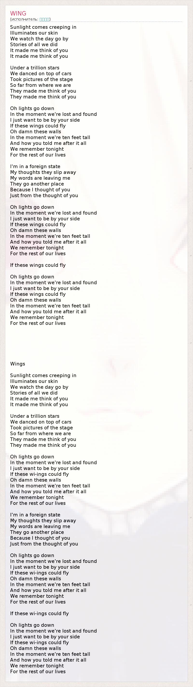 Солнечный свет подкрадывается И освещает нашу кожу. Мы проводим день, Воскрешая истории о том, как у нас всё было. 1 Поэтому теперь я думаю о тебе, Поэтому теперь я думаю о тебе... Под мириадами звезд Мы танцевали на крышах машин, Фотографировали места, Настолько далёкие от нас. Поэтому теперь я думаю о тебе, Поэтому теперь я думаю о тебе... Гаснут огни... В тот момент, когда мы потеряемся и найдёмся, Я просто хочу быть рядом с тобой. Если бы на этих крыльях можно было улететь!.. К чёрту эти стены В тот миг, когда мы их переросли! 2 И как ты после всего мне сказал: Мы запомним эту ночь На всю оставшуюся жизнь... Я в чужой стране. Мои мысли ускользают, Слова покидают меня, Уходя в другое место, Потому что я подумала о тебе, Как раз при мысли о тебе... Гаснут огни... В тот момент, когда мы потеряемся и найдёмся, Я просто хочу быть рядом с тобой. Если бы на этих крыльях можно было улететь!.. К чёрту эти стены В тот миг, когда мы их переросли! И как ты после всего мне сказал: Мы запомним эту ночь На всю оставшуюся жизнь... Если бы на этих крыльях можно было улететь!.. Гаснут огни... В тот момент, когда мы потеряемся и найдёмся, Я просто хочу быть рядом с тобой. Если бы на этих крыльях можно было улететь!.. К чёрту эти стены В тот миг, когда мы их переросли! И как ты после всего мне сказал: Мы запомним эту ночь На всю оставшуюся жизнь... 1 - дословно: Мы смотрим, как мимо проходит день, / Истории о том, что мы делали 2 - дословно: когда мы ростом в 10 футов (~ 3 м 5 см). Этот вариант перевода позаимствован у Марины из Санкт-Петербурга Крылья* (перевод Fab Flute) Крадётся солнца диск, На коже блики искр. Взяла нас память в плен, И потому весь день Я в мыслях о тебе, Я в мыслях о тебе. Мы танцевать взошли На потолки машин, Снимали фото в честь Чудных далёких мест, Я помню о тебе, Я помню о тебе. О-о-о, гаснет свет, И в заветный для нас момент Я хочу унестись к тебе, Если б крыльям взлететь! О-о, стены – пыль, Вознеслись мы на сотни миль, И как ты после сказал, ту быль Будем видеть во сне До конца наших дней. Но я в чужом краю, Себя не узнаю, Мой ум попал в астрал, Потерян речи дар От мысли о тебе, Лишь мысли о тебе. О-о-о, гаснет свет, И в заветный для нас момент Я хочу унестись к тебе, Если б крыльям взлететь! О-о, стены – пыль, Вознеслись мы на сотни миль, И как ты после сказал, ту быль Будем видеть во сне До конца наших дней. Если б крыльям взлететь... О-о, гаснет свет, И в заветный для нас момент Я хочу унестись к тебе, Если б крыльям взлететь! О-о, стены – пыль, Вознеслись мы на сотни миль, И как ты после сказал, ту быль Будем видеть во сне До конца наших дней. * Поэтический (эквиритмический) перевод.
