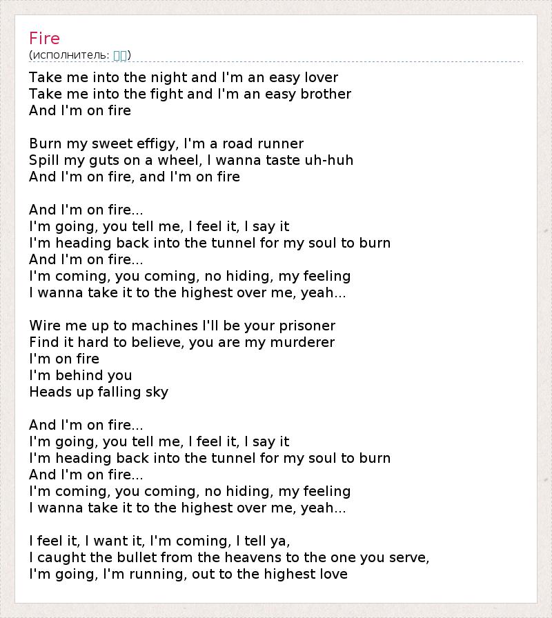 Take me into the night and I'm an easy lover Take me into the fight and I'm an easy brother And I'm on fire Burn my sweet effigy, I'm a road runner Spill my guts on a wheel, I wanna taste uh-huh And I'm on fire, and I'm on fire And I'm on fire... I'm going, you tell me, I feel it, I say it I'm heading back into the tunnel for my soul to burn And I'm on fire... I'm coming, you coming, no hiding, my feeling I wanna take it to the highest over me, yeah... Wire me up to machines I'll be your prisoner Find it hard to believe, you are my murderer I'm on fire I'm behind you Heads up falling sky And I'm on fire... I'm going, you tell me, I feel it, I say it I'm heading back into the tunnel for my soul to burn And I'm on fire... I'm coming, you coming, no hiding, my feeling I wanna take it to the highest over me, yeah... I feel it, I want it, I'm coming, I tell ya, I caught the bullet from the heavens to the one you serve, I'm going, I'm running, out to the highest love