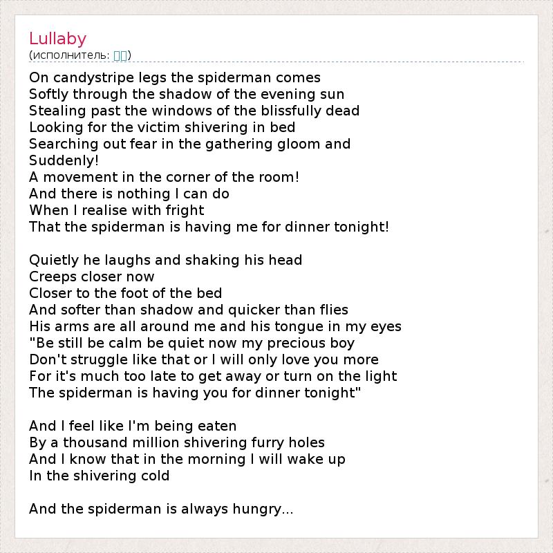 Человек-паук приходит на конфетных ножках. Нежно проходя сквозь тень вечернего солнца, Он прокрадывается в окна блаженного мертвеца. В поисках жертвы, дрожащей в постели, Он обнаруживает страх в сгущающейся тьме и Внезапно! Движение в углу комнаты! И я уже ничего не могу поделать, Когда с ужасом понимаю, Что человек-паук сожрет меня сегодня ночью! Он тихо смеется и трясет головой, Подползая все ближе, Все ближе к подножью кровати. Нежнее тени и быстрее мухи Его руки обхватывают меня, а его язык дотрагивается моих глаз. - Спокойней, тише, мой милый мальчик, Не борись со мной, а то ты понравишься мне еще больше. Уже поздно отступать или включать свет, Человек-паук сожрет тебя сегодня ночью! Мне кажется, что меня съели Тысячи миллионов дрожащих пушистых ртов, И я знаю, что утром я проснусь, Дрожа в холодном поту. А человек-паук вечно голоден...