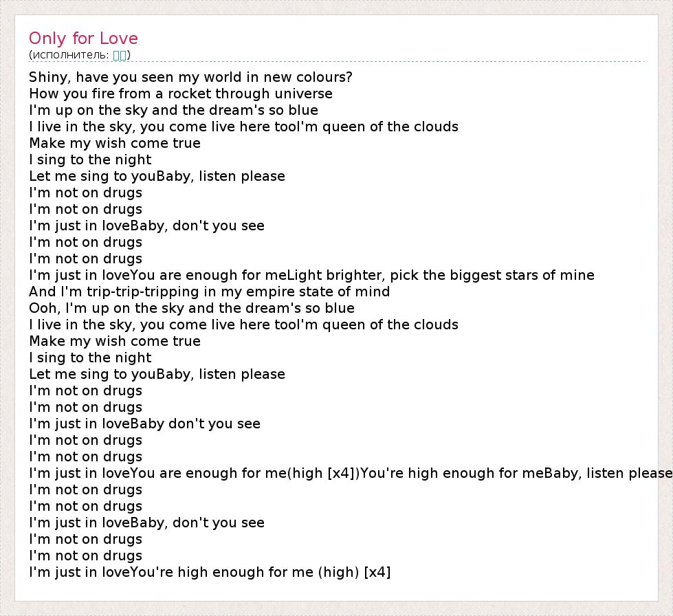 Shiny, have you seen my world in new colours? How you fire from a rocket through universe I'm up on the sky and the dream's so blue I live in the sky, you come live here tooI'm queen of the clouds Make my wish come true I sing to the night Let me sing to youBaby, listen please I'm not on drugs I'm not on drugs I'm just in loveBaby, don't you see I'm not on drugs I'm not on drugs I'm just in loveYou are enough for meLight brighter, pick the biggest stars of mine And I'm trip-trip-tripping in my empire state of mind Ooh, I'm up on the sky and the dream's so blue I live in the sky, you come live here tooI'm queen of the clouds Make my wish come true I sing to the night Let me sing to youBaby, listen please I'm not on drugs I'm not on drugs I'm just in loveBaby don't you see I'm not on drugs I'm not on drugs I'm just in loveYou are enough for me(high [x4])You're high enough for meBaby, listen please I'm not on drugs I'm not on drugs I'm just in loveBaby, don't you see I'm not on drugs I'm not on drugs I'm just in loveYou're high enough for me (high) [x4]